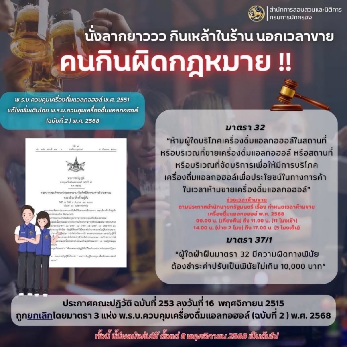โดยระบุว่า จุดจบสายลาก ห้ามดื่มในร้านนอกเวลาขาย เมื่อไม่กี่ชั่วโมงที่แล้ว ทางกรมการปกครอง ออกมาเตือนประชาชนเกี่ยวกับ การนั่งดื่มในร้านเหล้านอกเวลาขาย “เสี่ยงผิด” กฎหมายตาม พรบ.ควบคุมเครื่องดื่มแอลกอฮอล์ ฉบับที่ 2 (พ.ศ.2568)