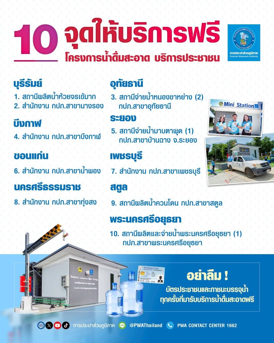 นายจักรพงศ์ คำจันทร์ ผู้ว่าการ กปภ. เปิดเผยว่า กปภ. มุ่งมั่นดำเนินโครงการ “น้ำดื่มสะอาด Mini Station” เพื่อลดความเหลื่อมล้ำในการเข้าถึงน้ำดื่มสะอาด ปลอดภัย อีกทั้งช่วยลดภาระค่าครองชีพของประชาชนในการซื้อน้ำดื่ม ตามนโยบายของกระทรวงมหาดไทย โดยติดตั้งระบบผลิตน้ำดื่มในพื้นที่ให้บริการของ กปภ.สาขา ซึ่งใช้เทคโนโลยีการกรองแบบรีเวิร์สออสโมซิส (RO) และฆ่าเชื้อด้วยรังสีอัลตร้าไวโอเลต (UV) สามารถผลิตน้ำดื่มได้สูงถึง 2,000 ลิตรต่อชั่วโมง ปัจจุบัน กปภ. เปิดให้บริการน้ำดื่มสะอาดฟรี ไม่มีค่าใช้จ่ายแล้ว 10 แห่ง ได้แก่ 1. สถานีผลิตน้ำห้วยจรเข้มาก กปภ.สาขาบุรีรัมย์ 2. สำนักงาน กปภ.สาขานางรอง จ.บุรีรัมย์ 3. สถานีจ่ายน้ำหนองขาหย่าง (2) กปภ.สาขาอุทัยธานี จ.อุทัยธานี 4. สำนักงาน กปภ.สาขาบึงกาฬ จ.บึงกาฬ 5. สถานีจ่ายน้ำมาบตาพุด (1) กปภ.สาขาบ้านฉาง จ.ระยอง6. สำนักงาน กปภ.สาขาน้ำพอง จ.ขอนแก่น 7. สำนักงาน กปภ.สาขาเพชรบุรี จ.เพชรบุรี 8. สำนักงาน กปภ.สาขาทุ่งสง จ.นครศรีธรรมราช 9. สถานีผลิตน้ำควนโดน กปภ.สาขาสตูล จ.สตูล และ 10. สถานีผลิตและจ่ายน้ำพระนครศรีอยุธยา (1) กปภ.สาขาพระนครศรีอยุธยา จ.พระนครศรีอยุธยา มีประชาชนรับบริการน้ำดื่มสะอาดไปบริโภคแล้วกว่า 1.12 ล้านลิตร เทียบเท่าน้ำดื่มบรรจุขวด (ขนาด 600 มล.) จำนวน 1,875,540 ขวด โดย กปภ. จะขยายผลโครงการ “น้ำดื่มสะอาด Mini Station” ซึ่งเป็นโครงการที่ครอบคลุมทั้งด้านสุขภาพ เศรษฐกิจ และสิ่งแวดล้อมอย่างต่อเนื่องในทุกภูมิภาคต่อไปเพื่อยกระดับคุณภาพชีวิตประชาชนให้เข้าถึงน้ำดื่มสะอาดอย่างทั่วถึงและยั่งยืน