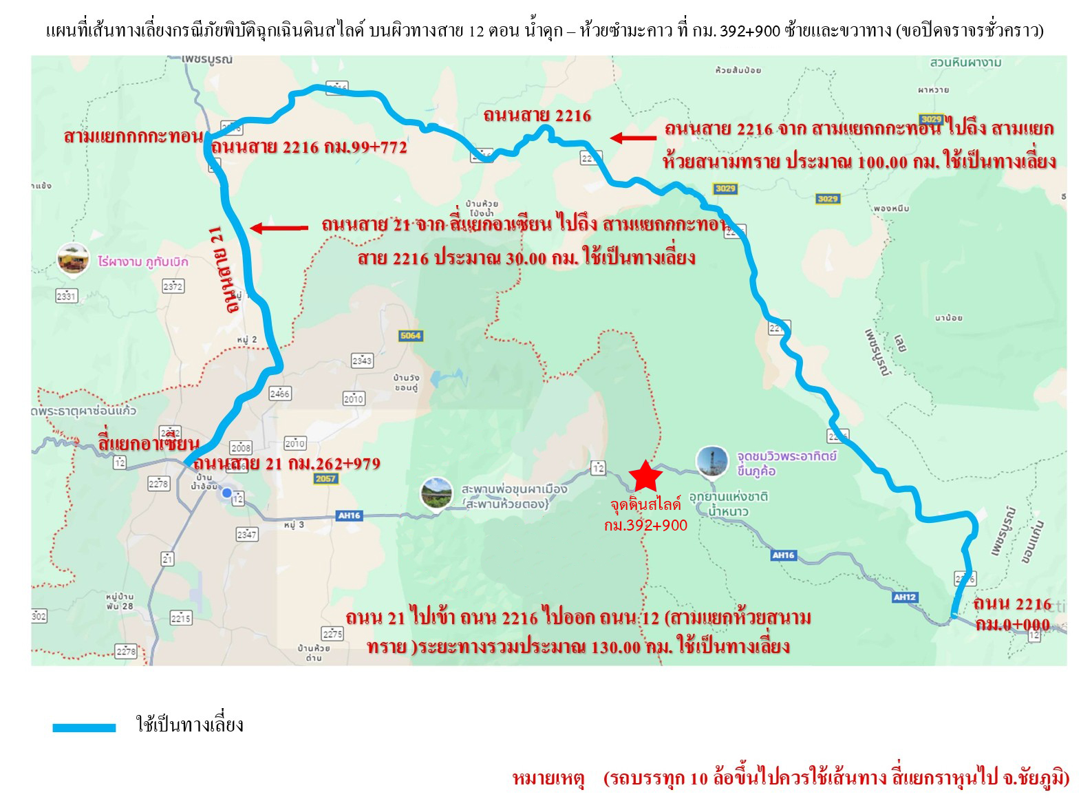 แขวงทางหลวงเพชรบูรณ์ที่ 1 แจ้งข่าวประชาสัมพันธ์ วันที่ 19 กันยายน 2568 จากฝนตกหนัก เกิดดินสไลด์และหินร่วงทับผิวทาง ทางหลวงหมายเลข 12 น้ำดุก–ห้วยซำมะคาว หล่มสัก-น้ำหนาว กม. 392+900 รถทุกชนิดไม่สามารถผ่านได้
