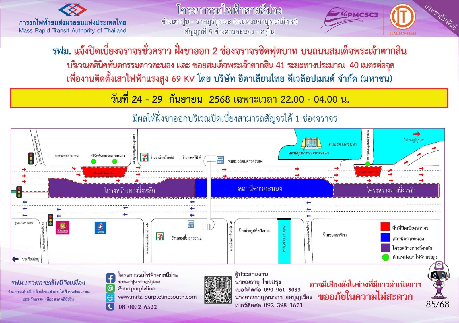 การรถไฟฟ้าขนส่งมวลชนแห่งประเทศไทย (รฟม.) แจ้งว่า บริษัท อิตาเลียนไทย ดีเวล๊อปเมนต์ จำกัด (มหาชน) ผู้รับจ้างงานก่อสร้างทางวิ่งและสถานียกระดับ อาคารจอดรถไฟฟ้าและอาคารจอดแล้วจร โครงการรถไฟฟ้าสายสีม่วง ช่วงเตาปูน - ราษฎร์บูรณะ (วงแหวนกาญจนาภิเษก) สัญญาที่ 5 ช่วงดาวคะนอง - ครุใน มีความจำเป็นต้องปิดเบี่ยงจราจรชั่วคราว ฝั่งขาออก 2 ช่องจราจร ชิดฟุตบาท บนถนนสมเด็จพระเจ้าตากสิน บริเวณคลินิกทันตกรรมดาวคะนอง และ ซอยสมเด็จพระเจ้าตากสิน 41 ระยะทางประมาณ 40 เมตรต่อจุด เพื่องานติดตั้งเสาไฟฟ้าแรงสูง 69 kV ในวันที่ 24 - 29 กันยายน 2568 เฉพาะเวลา 22.00 - 04.00 น. โดยมีผลให้ฝั่งขาออกบริเวณปิดเบี่ยงสามารถสัญจรได้ 1 ช่องจราจร