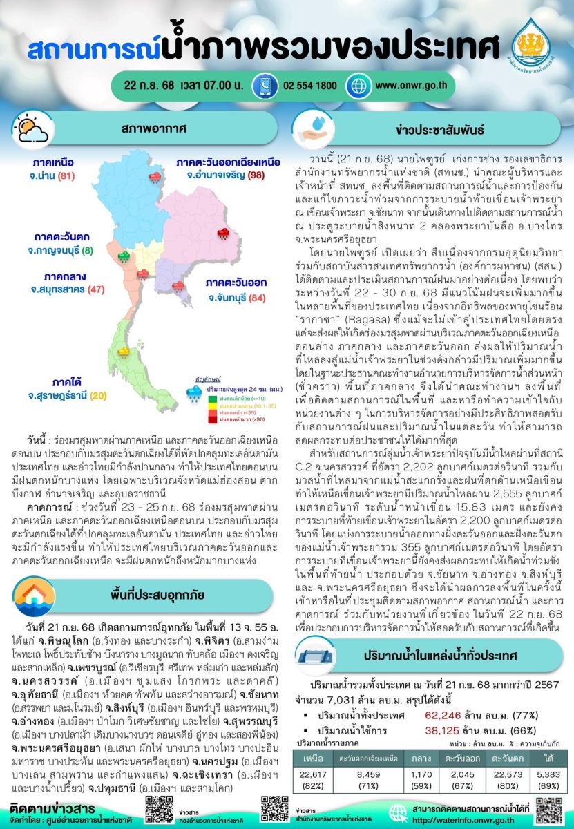 สำนักงานทรัพยากรน้ำแห่งชาติ สรุปสถานการณ์น้ำภาพรวมของประเทศ วันที่ 22 ก.ย. 68 เวลา 7.00 น.