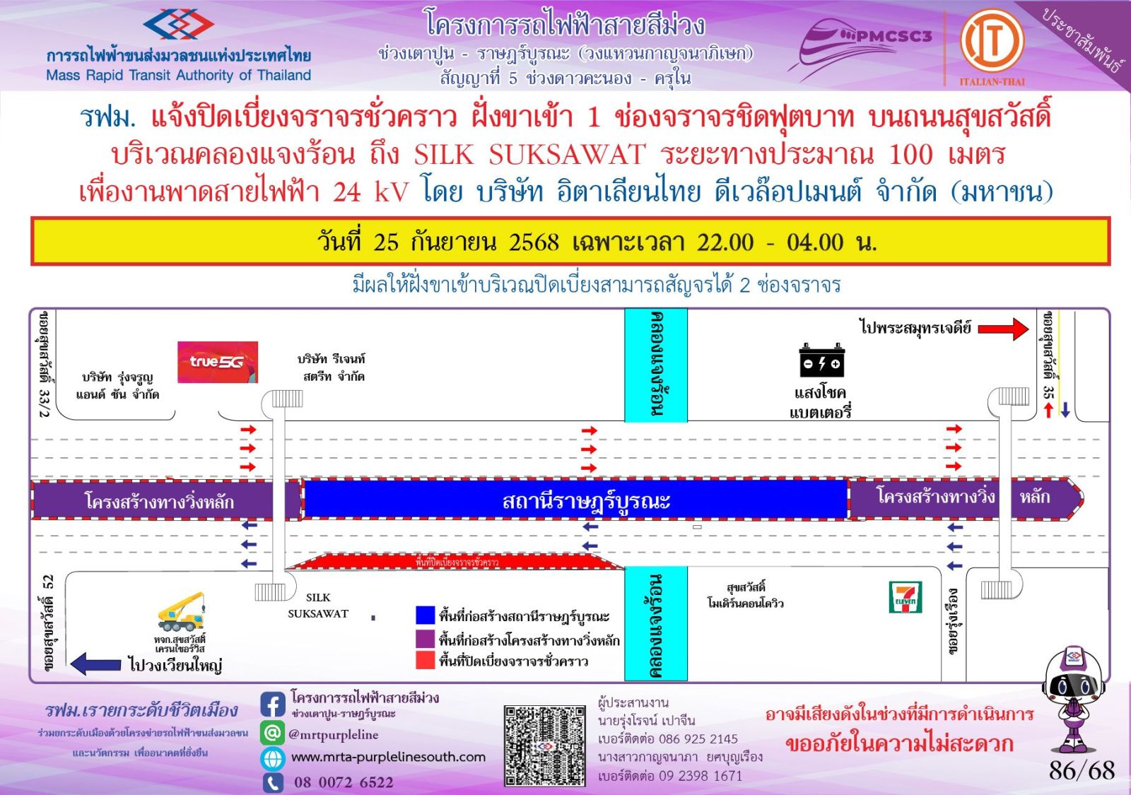 การรถไฟฟ้าขนส่งมวลชนแห่งประเทศไทย (รฟม.) แจ้งว่า บริษัท อิตาเลียนไทย ดีเวล๊อปเมนต์ จำกัด (มหาชน) ผู้รับจ้างงานก่อสร้างทางวิ่งและสถานียกระดับ อาคารจอดรถไฟฟ้าและอาคารจอดแล้วจร โครงการรถไฟฟ้าสายสีม่วง ช่วงเตาปูน - ราษฎร์บูรณะ (วงแหวนกาญจนาภิเษก) สัญญาที่ 5 ช่วงดาวคะนอง - ครุใน มีความจำเป็นต้องปิดเบี่ยงจราจรชั่วคราว ฝั่งขาเข้า 1 ช่องจราจร ชิดฟุตบาท บนถนนสุขสวัสดิ์ บริเวณคลองแจงร้อน ถึง SILK SUKSAWAT ระยะทางประมาณ 100 เมตร เพื่องานพาดสายไฟฟ้า 24 kV ในวันที่ 25 กันยายน 2568 เฉพาะเวลา 22.00 - 04.00 น. โดยมีผลให้ฝั่งขาเข้าบริเวณปิดเบี่ยงสามารถสัญจรได้ 2 ช่องจราจร