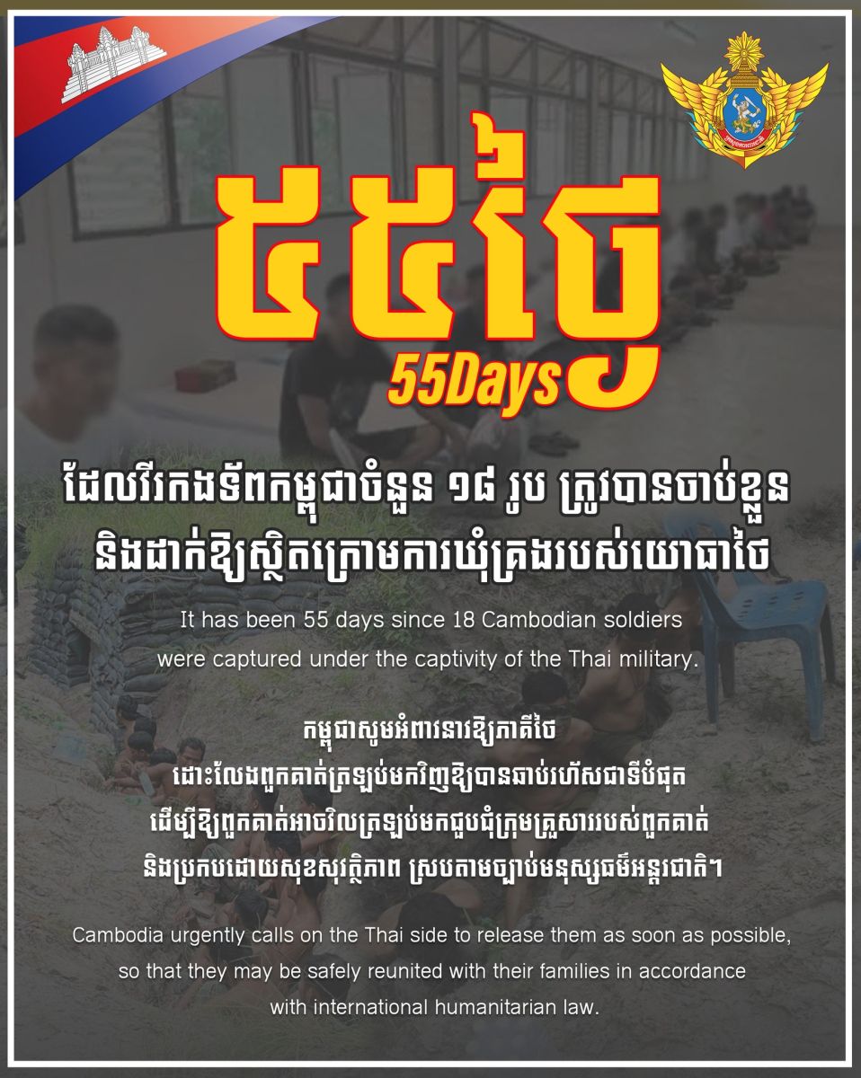 รัฐบาลกัมพูชาขอย้ำว่า รัฐบาลกัมพูชาได้พยายามอย่างหนัก และจะยังคงดำเนินความพยายามต่อไป โดยใช้กลไกทุกช่องทางที่มีอยู่ เพื่อผลักดันให้กองทัพไทยปล่อยและส่งตัวทหารกัมพูชาทั้ง 18 นายกลับคืนโดยเร็วและปลอดภัยที่สุด