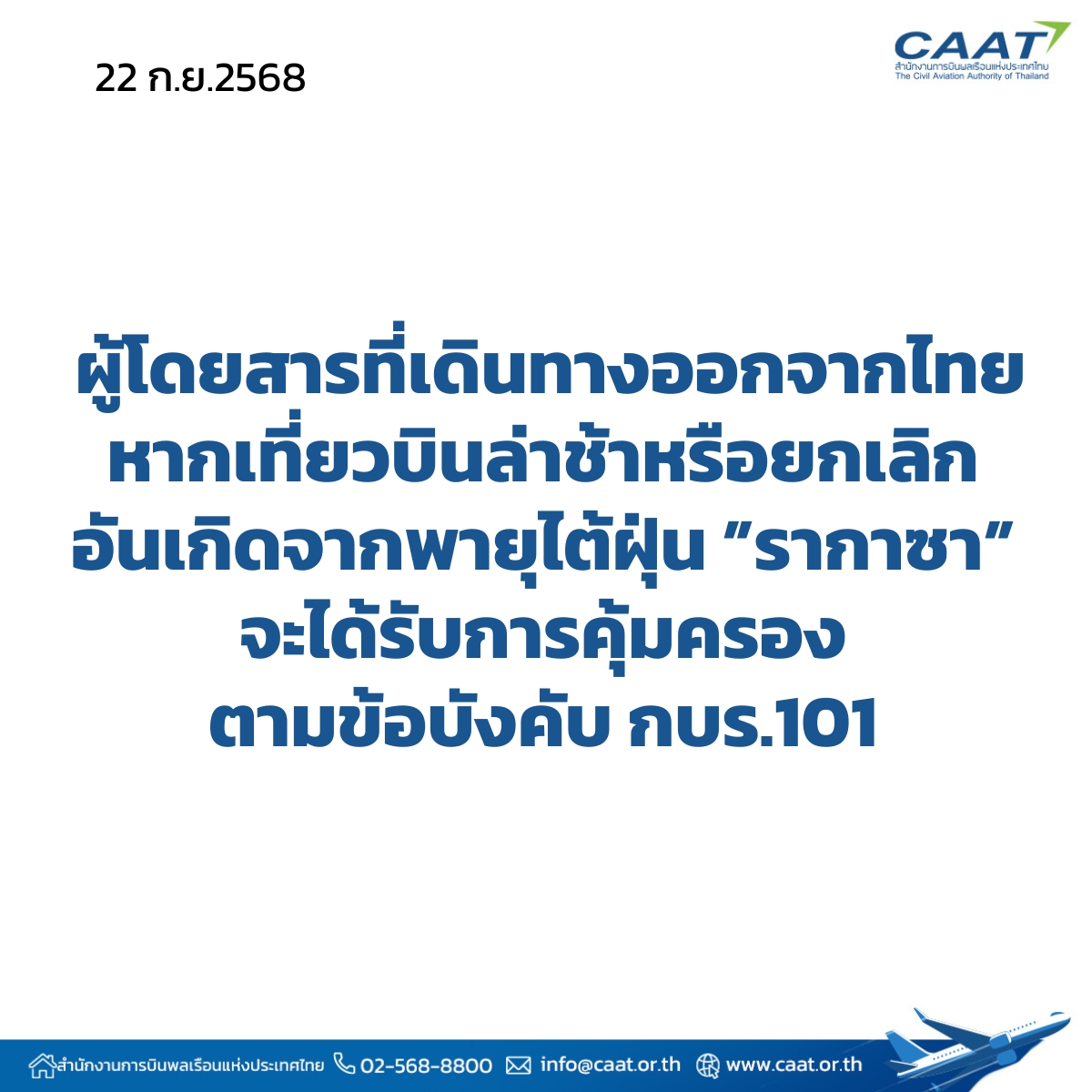 สำนักงานการบินพลเรือนแห่งประเทศไทย (CAAT) ขอแจ้งให้ผู้โดยสารที่มีแผนการเดินทางภายในประเทศและระหว่างประเทศในช่วงนี้ ติดตามข้อมูลข่าวสารและสถานะของเที่ยวบินกับสายการบินอย่างใกล้ชิด เนื่องจากอิทธิพลของพายุไต้ฝุ่น “รากาซา” ที่อาจส่งผลกระทบต่อการให้บริการเที่ยวบิน โดยพายุไต้ฝุ่น "รากาซา (Ragasa)" กำลังเคลื่อนตัวสู่ทะเลจีนใต้ตอนบน ผ่านเกาะไต้หวันและเขตปกครองพิเศษฮ่องกง ระหว่างวันที่ 22-24 กันยายน 2568 ทำให้มีฝนตกหนักและลมแรงในหลายพื้นที่ ส่งผลกระทบให้หลายสายการบินที่ให้บริการในพื้นที่ที่พายุเคลื่อนผ่านจำเป็นต้องยกเลิกหรือมีเที่ยวบินล่าช้า เพื่อความปลอดภัยในการเดินทาง
