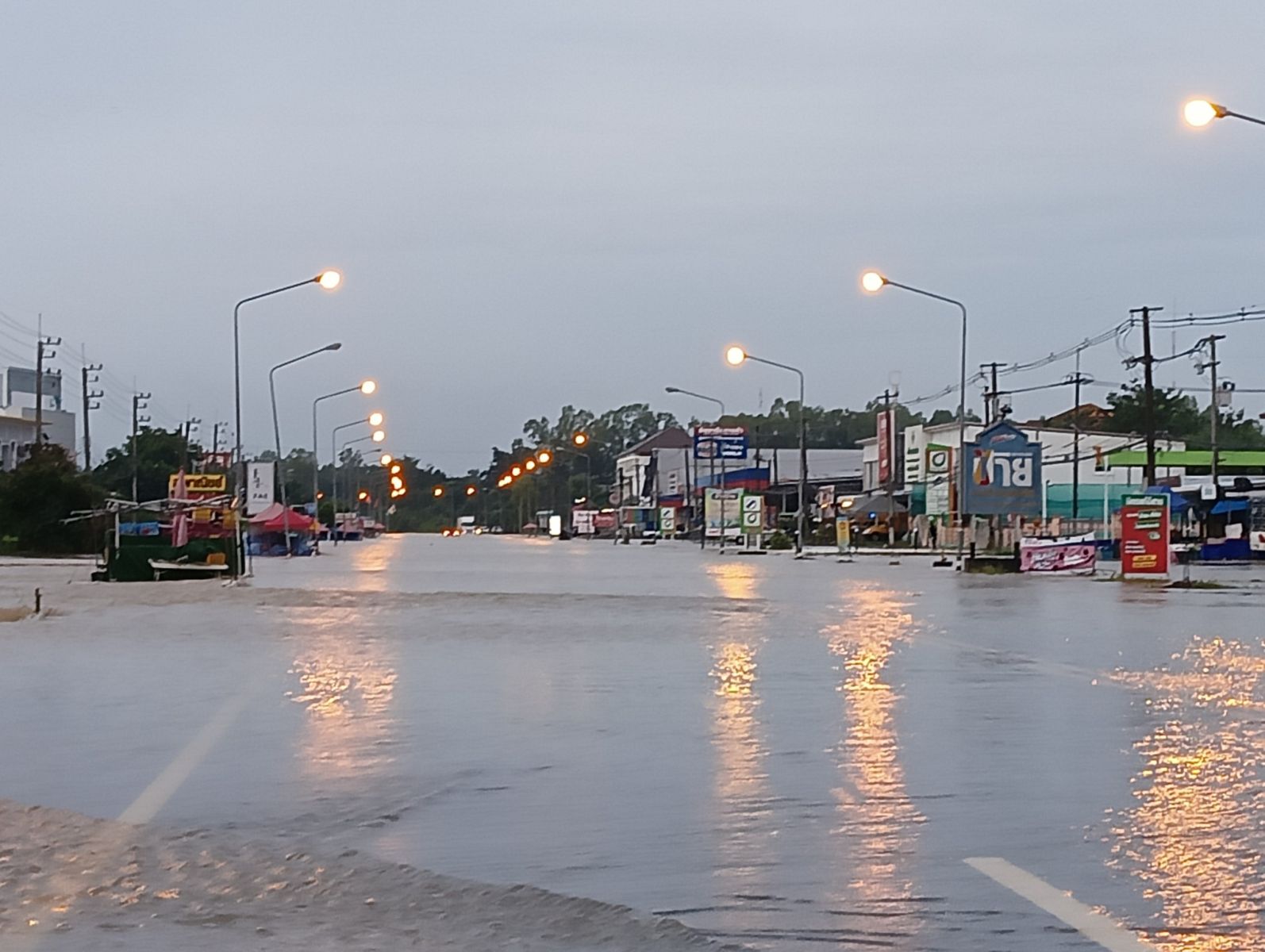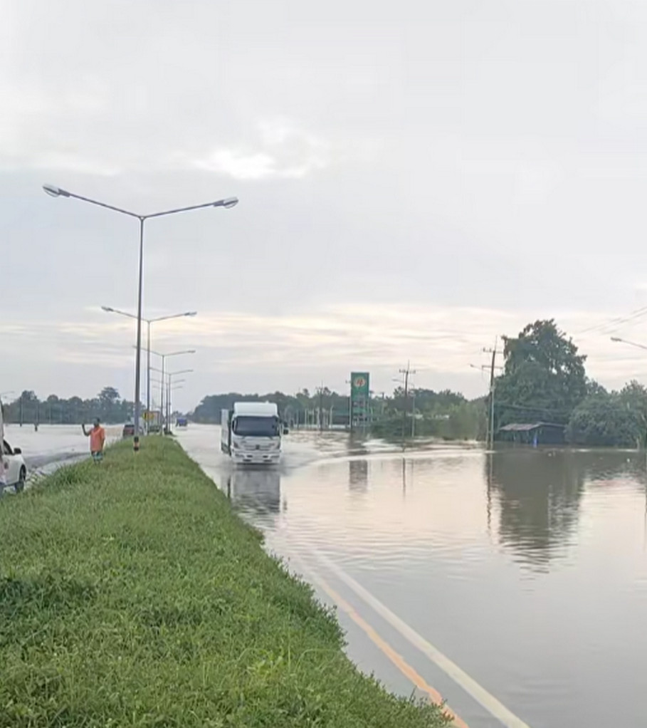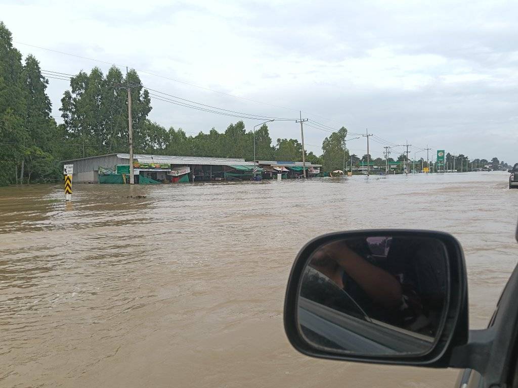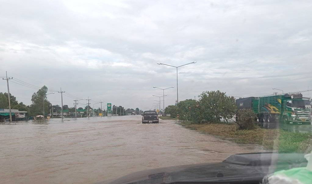 ถนนหมายเลข 24 โชคชัย-เดชอุดมบริเวณหน้าปั๊ม PT สังขะ และ ตั้งแต่หน้าโรงเรียนสังขะวิทยาคม อ.สังขะ จ.สุรินทร์ มีน้ำท่วมสูงแต่รถเล็กไม่แนะนำให้สัญจรผ่าน