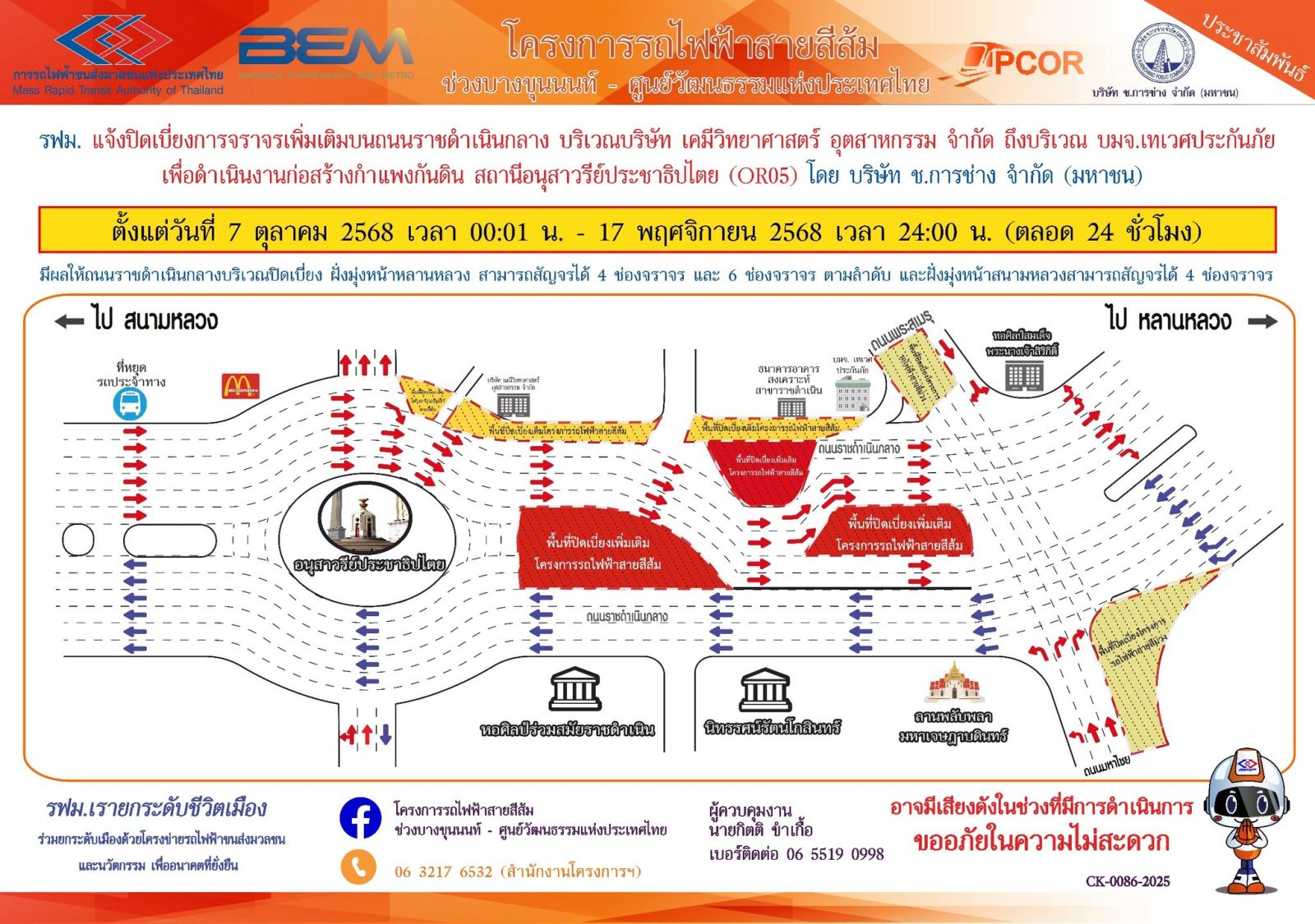 การรถไฟฟ้าขนส่งมวลชนแห่งประเทศไทย (รฟม.) แจ้งว่า บริษัท ช.การช่าง จำกัด (มหาชน) ผู้รับจ้างออกแบบและก่อสร้างอุโมงค์ทางวิ่งและสถานีใต้ดิน โครงการรถไฟฟ้าสายสีส้ม ช่วงบางขุนนนท์ - ศูนย์วัฒนธรรมแห่งประเทศไทย มีความจำเป็นต้องปิดเบี่ยงการจราจรเพิ่มเติมบนถนนราชดำเนินกลาง ฝั่งมุ่งหน้าหลานหลวง เพื่อดำเนินงานก่อสร้างกำแพงกันดิน สถานีอนุสาวรีย์ประชาธิปไตย (OR05) ตั้งแต่วันที่ 7 ตุลาคม 2568 เวลา 00:01 น. – 17 พฤศจิกายน 2568 เวลา 24:00 น. (ตลอด 24 ชั่วโมง) โดยมีรายละเอียดดังนี้