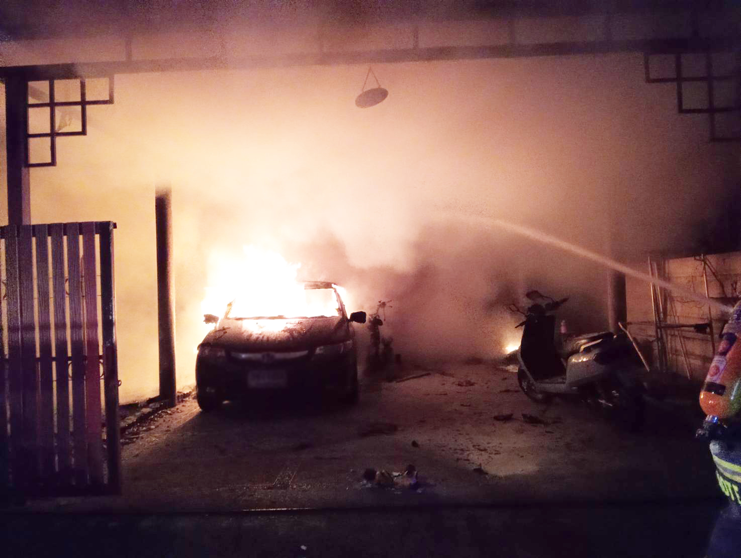ลักษณะที่เกิดเหตุเป็นบ้านเดี่ยวคอนกรีต 2 ชั้น ใช้เป็นที่พักอาศัย ต้นเพลิงเกิดขึ้นที่ชั้นล่าง ภายในโรงจอดรถ เพลิงลุกไหม้รถจักรยานไฟฟ้า ไม่ทราบสี หมายเลขทะเบียน กรุงเทพมหานคร เสียหายหมดทั้งคัน และลุกลามรถยนต์นั่งส่วนบุคคลชนิดเก๋ง สีดำ หมายเลขทะเบียน กรุงเทพมหานคร เสียหายหมดทั้งคัน ลุกลามรถจักรยานไฟฟ้า สีฟ้า หมายเลขทะเบียน กรุงเทพมหานคร เสียหายเล็กน้อย และลุกลามเข้าบริเวณบ้านชั้นล่างเสียหายบางส่วน พื้นที่เสียหายโดยประมาณ 10 ตารางเมตร รถดับเพลิงใช้น้ำทำการดับเพลิงสงบ