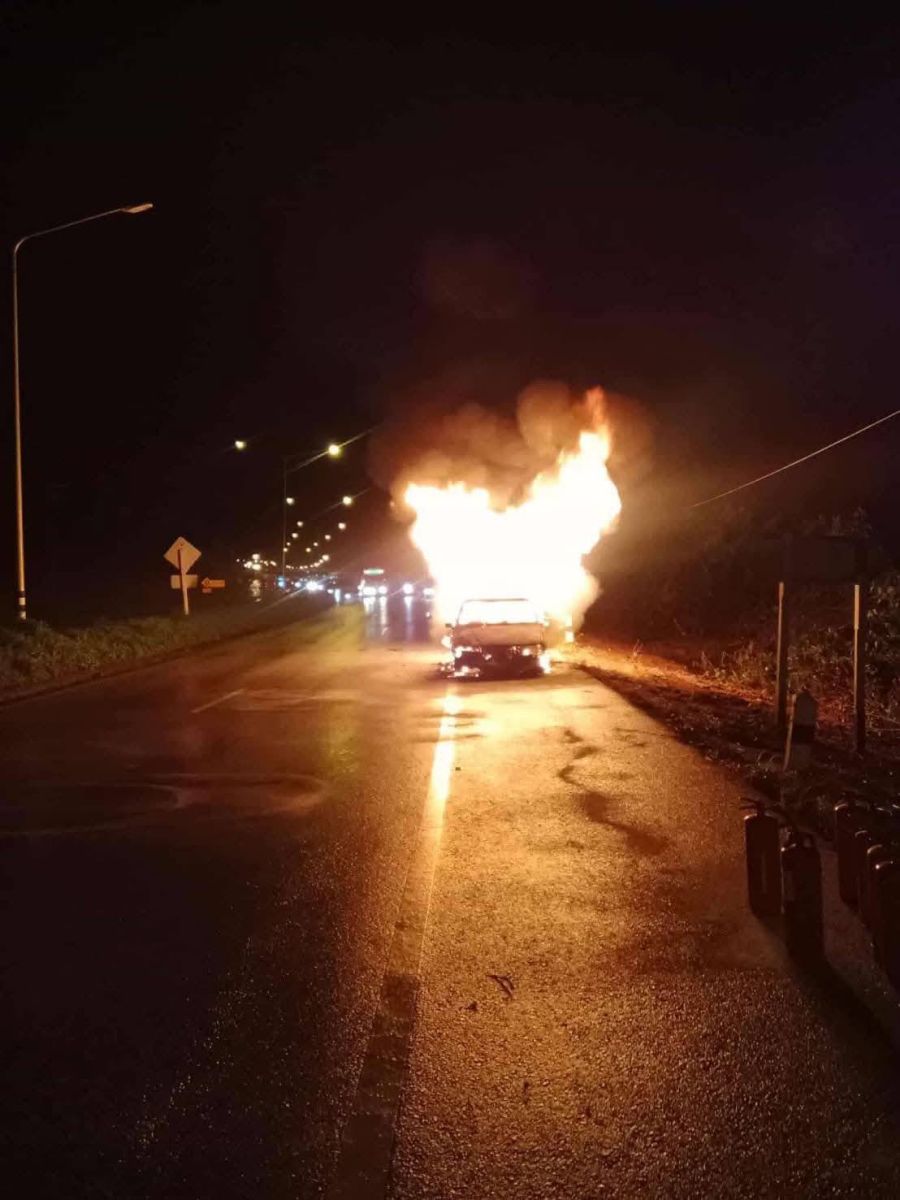 ไฟไหม้รถยนต์ริมถนนหมายเลข 11 เสียหายวอดทั้งคัน โชคดีไร้บาดเจ็บหรือเสียชีวิต จ.อุตรดิตถ์
