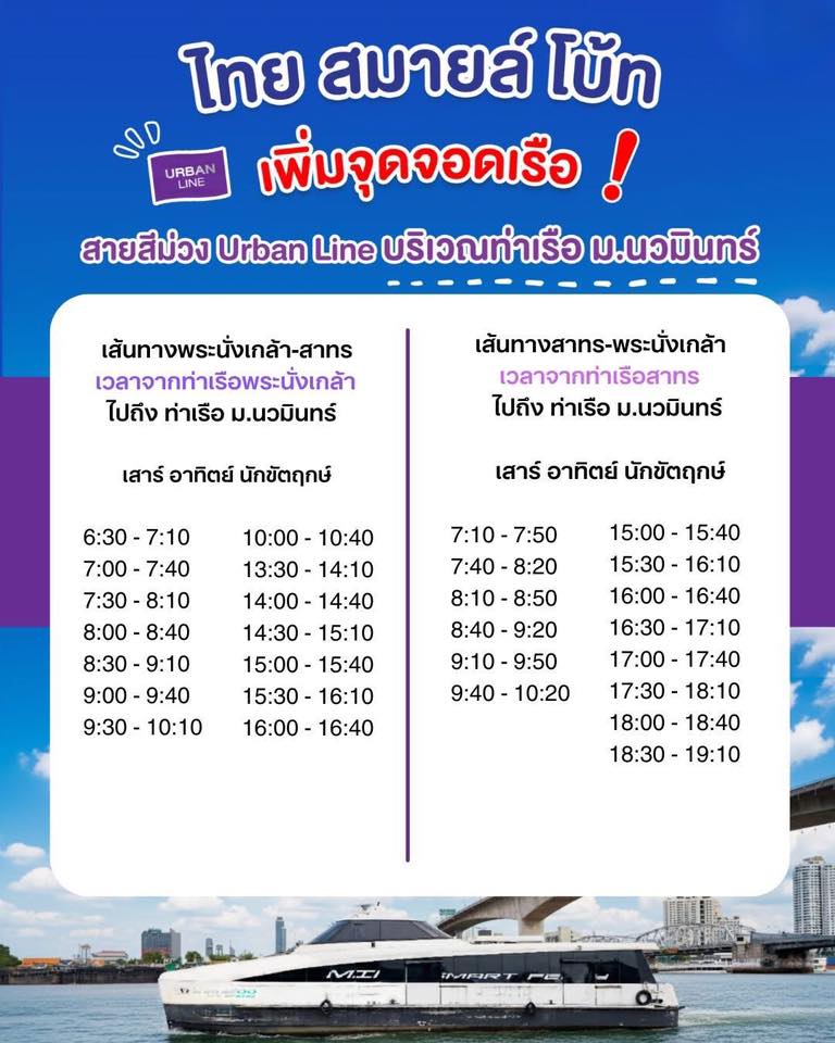 ล่าสุด ไทย สมายล์ โบ้ท จึงได้เพิ่มจุดจอดเรือ สายสีม่วง Urban Line บริเวณท่า ม.นวมินทร์