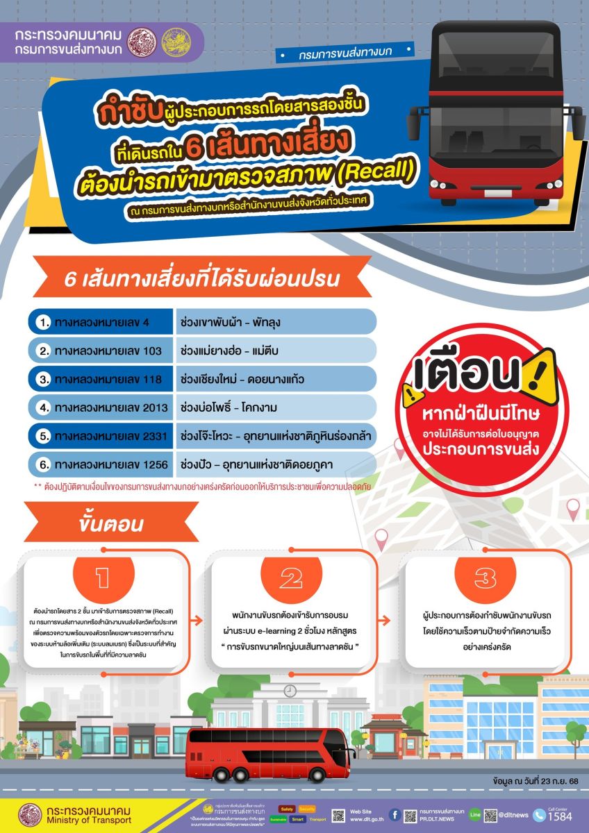 กรมการขนส่งทางบก กำชับผู้ประกอบการรถโดยสารสองชั้นที่เดินรถใน 6 เส้นทางเสี่ยงที่ได้รับผ่อนปรนตามมติคณะกรรมการควบคุมการขนส่งทางบกกลาง ได้แก่