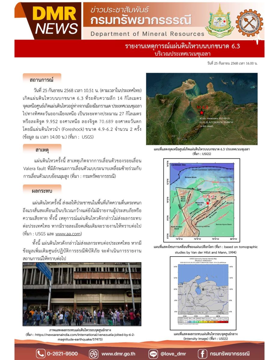 วันที่ 25 กันยายน 2568 เวลา 10.51 น. (ตามเวลาในประเทศไทย) เกิดแผ่นดินไหวบนบกขนาด 6.3 ที่ระดับความลึก 14 กิโลเมตร จุดเหนือศูนย์เกิดแผ่นดินไหวอยู่ห่างจากเมืองมีมกรานเด ประเทศเวเนซุเอลา ไปทางทิศตะวันออกเฉียงเหนือ เป็นระยะทางประมาณ 27 กิโลเมตร หรือละติจูด 9.952 องศาเหนือ ลองจิจูด 70.689 องศาตะวันตก โดยมีแผ่นดินไหวนำ (Foreshock) ขนาด 4.9-6.2 จำนวน 2 ครั้ง (ที่มา : USGS)