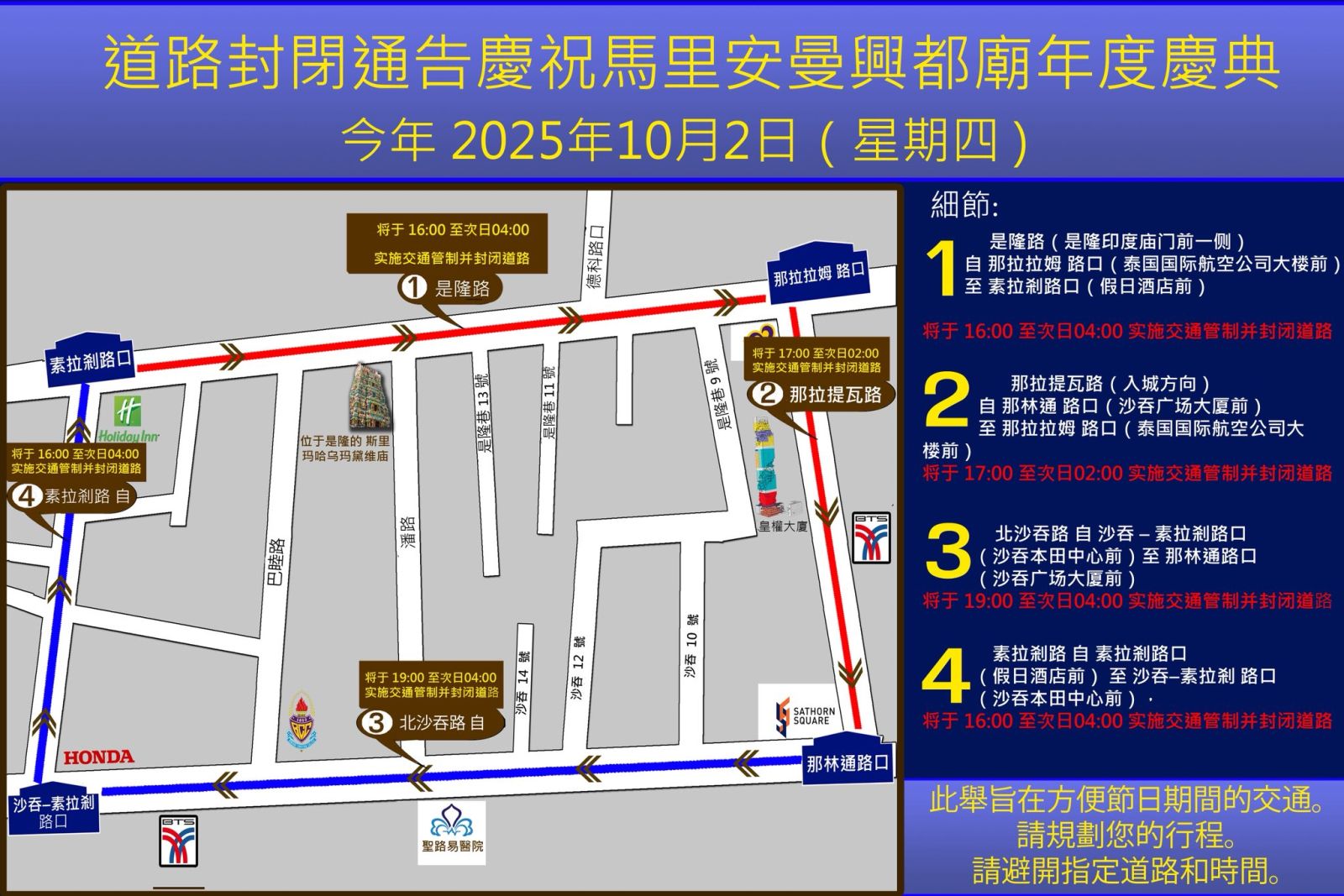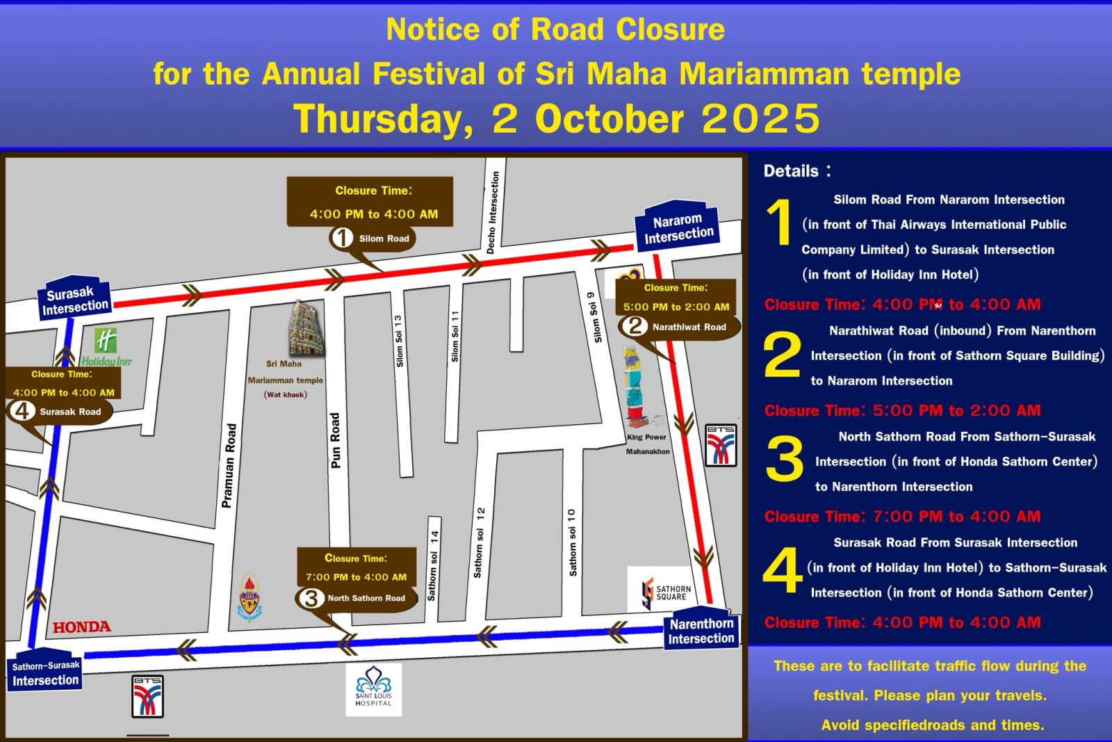 สถานีตำรวจนครบาลยานนาวา ประชาสัมพันธ์เส้นทาง กรณีมีการปิดการจราจร เนื่องในงานแห่ประเพณี วัดพระศรีมหาอุมาเทวี (วัดแขก สีลม) ประจำปี ๒๕๖๘ วันพฤหัสบดี ที่ ๒ ตุลาคม ๒๕๖๘