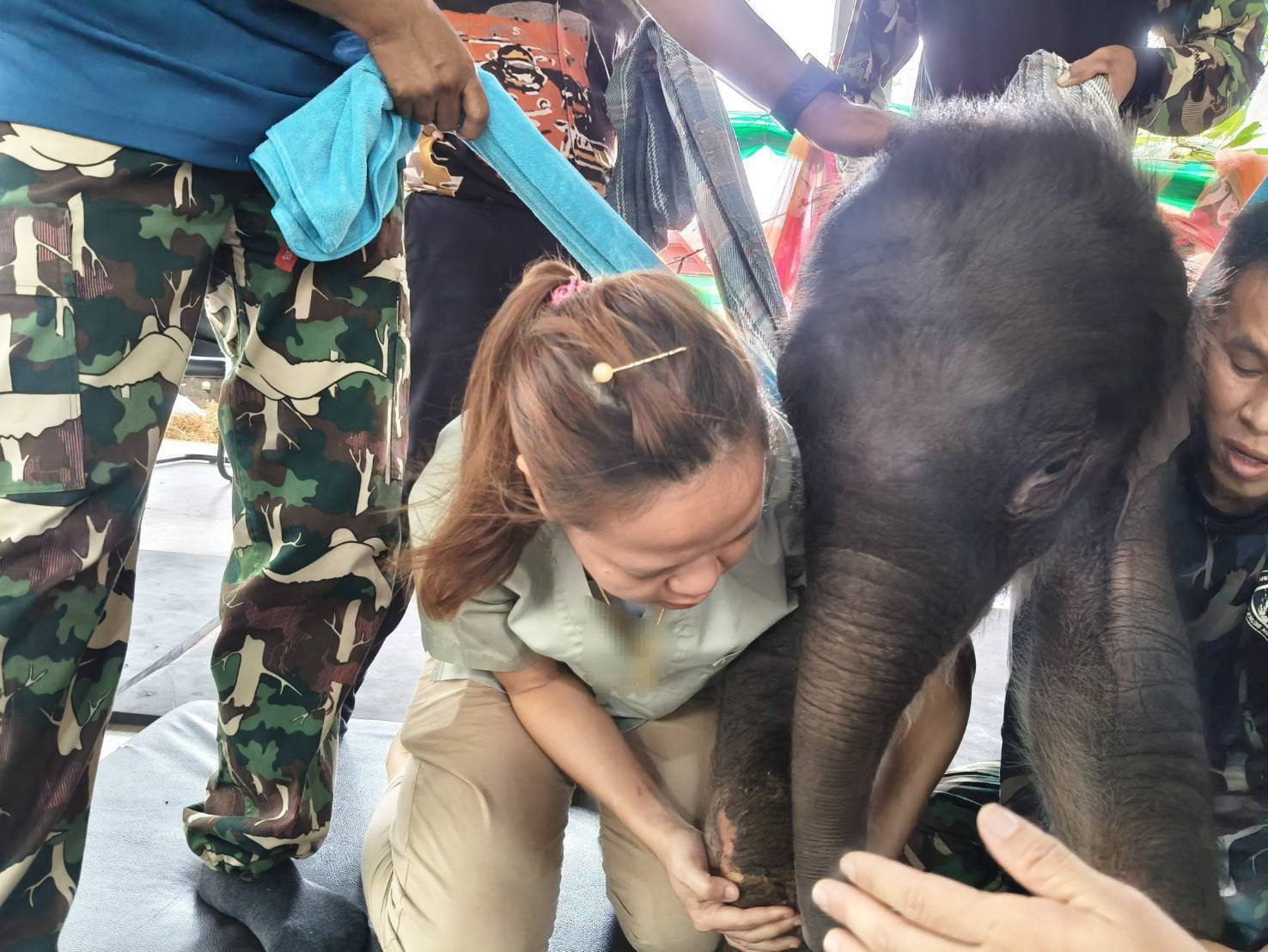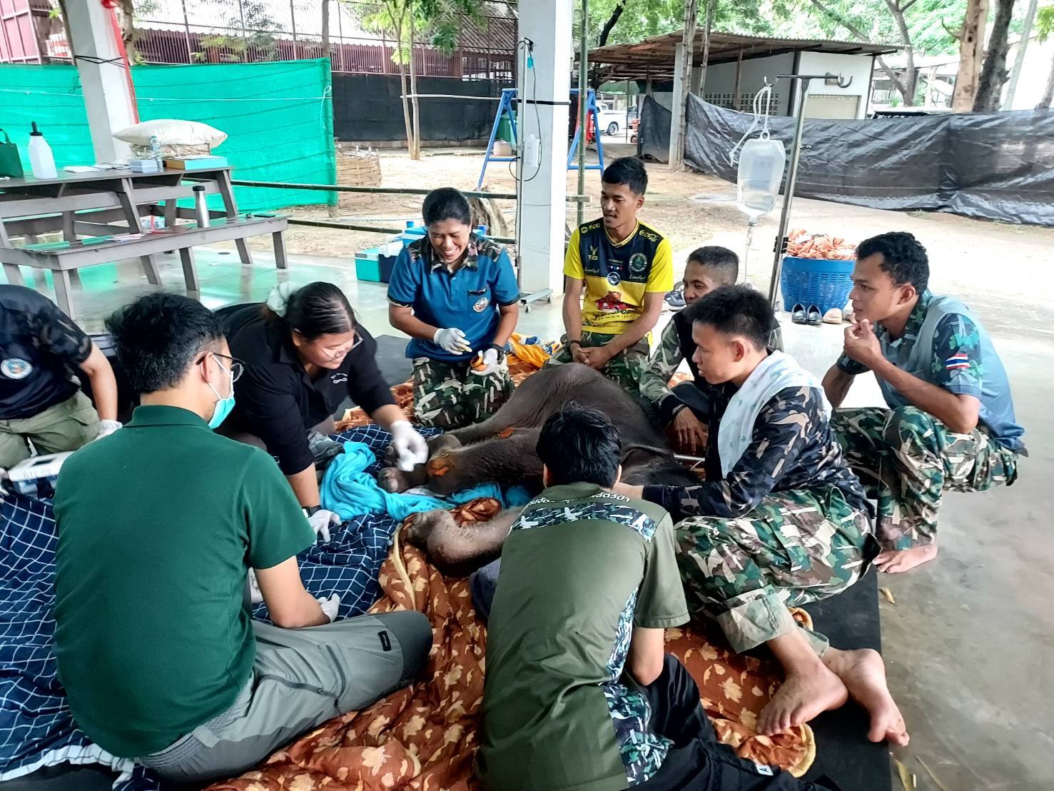 สำหรับการรักษาอาการความผิดปกติของกลุ่มเส้นเอ็นที่ข้อขาหน้าที่เป็นมาแต่กำเนิด ทีมสัตวแพทย์ได้ทำการรักษาด้วยการทำกายภาพบำบัดอย่างต่อเนื่อง โดยใช้วิธีอัลตราซาวด์, หัตถการยืดเหยียดข้อต่อ และเครื่องกรเะตุ้นแม่เหล็กไฟฟ้า ซึ่งจากการตรวจอาการพบว่าขาหน้าของลูกช้างเริ่มมีอาการคลายตัวดีขึ้นเล็กน้อย