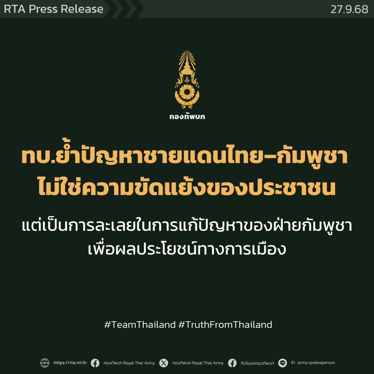 27 กันยายน 2568 กองทัพบก Royal Thai Army โพสต์ข้อความระบุ จากการที่วานนี้ (26 ก.ย. 68) สมเด็จฮุน มาเนต นายกรัฐมนตรีกัมพูชา โพสต์ข้อความกล่าวถึงเรื่องการปักปันเขตแดนระหว่างไทย–กัมพูชา ในพื้นที่ จ.สระแก้ว โดยในหลายประเด็นพบว่ามีการกล่าวอ้างและตอบโต้ต่อคำชี้แจงของฝ่ายไทยด้วยข้อมูลที่ไม่ถูกต้องและอาจทำให้สาธารณชนเกิดความสับสน