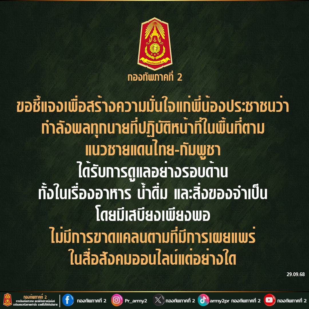 กองทัพภาคที่ 2 ชี้แจงเพื่อสร้างความมั่นใจแก่พี่น้องประชาชนว่า กำลังพลทุกนายที่ปฏิบัติหน้าที่ในพื้นที่ตามแนวชายแดนไทย-กัมพูชา ได้รับการดูแลอย่างรอบด้าน ทั้งในเรื่องอาหาร น้ำดื่ม และสิ่งของจำเป็น โดยมีเสบียงเพียงพอ ไม่มีการขาดแคลนตามที่มีการเผยแพร่ในสื่อสังคมออนไลน์แต่อย่างใด