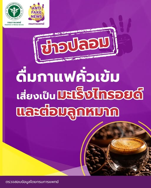 กรมการแพทย์ เตือน รู้ทันข่าวปลอม ดื่มกาแฟคั่วเข้มเสี่ยงเป็นมะเร็งไทรอยด์ และต่อมลูกหมาก ข้อมูลนี้แพร่กระจายอย่างไวในโลกโซเชียล แต่ข้อเท็จจริงจากงานวิจัย พบว่า การดื่มกาแฟในชีวิตประจำวันระดับปกติไม่ได้เป็นสาเหตุของมะเร็งต่อมลูกหมากหรือไทรอยด์ โดยที่บางงานวิจัยกลับพบว่า กาแฟอาจเป็นปัจจัยป้องกันมะเร็งต่อมลูกหมากอีกด้วย และจากข้อมูลที่กล่าวว่า จะเกิดเมื่อดื่มกาแฟเกิน 230 ช็อตต่อวัน ก็ไม่น่าจะเป็นไปได้