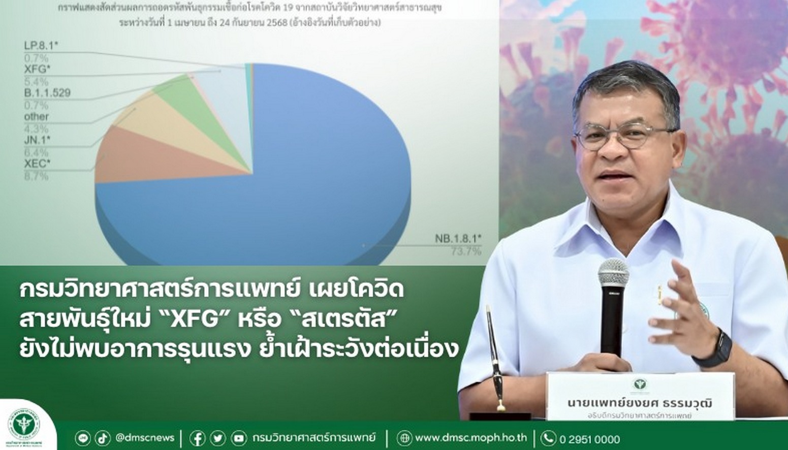 วันที่ 30 กันยายน 2568 นายแพทย์ยงยศ ธรรมวุฒิ อธิบดีกรมวิทยาศาสตร์การแพทย์ เปิดเผยว่า ประเทศไทยตรวจพบ สายพันธุ์ XFG ครั้งแรกเมื่อเดือนเมษายน 2568 และจนถึงวันที่ 24 กันยายน 2568 มีรายงานสะสมแล้ว 33 ราย ส่วนใหญ่อยู่ในเขตสุขภาพที่ 13 จำนวน 23 ราย โดยผู้ป่วยส่วนใหญ่มีอาการไม่รุนแรง เช่น ไข้ ไอ เจ็บคอ มีน้ำมูก และปวดศีรษะ และยังไม่มีรายใดต้องเข้ารับการรักษาในโรงพยาบาล ขณะเดียวกัน กรมวิทยาศาสตร์การแพทย์ ได้ถอดรหัสพันธุกรรมเชื้อโควิด 19 อย่างต่อเนื่อง โดยในช่วง 1 เมษายน – 24 กันยายน 2568 ได้ทำการถอดรหัสแล้ว 608 ตัวอย่าง พบว่าเป็น