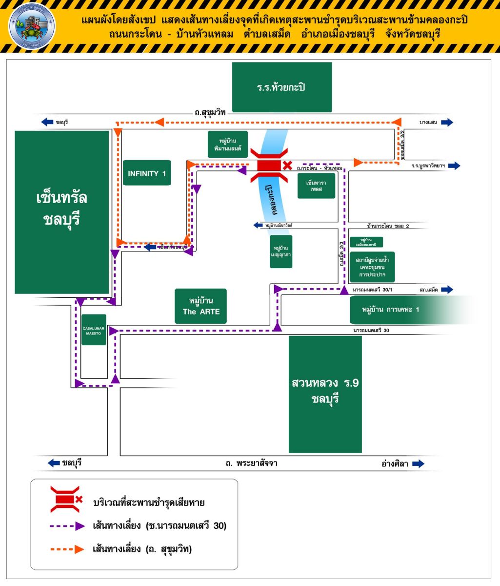 (16.55 น.) เทศบาลตำบลเสม็ด อ.เมืองชลบุรี ประกาศเทศบาลตำบลเสม็ด เนื่องด้วยขณะนี้ ได้เกิดเหตุคอสะพานทรุดตัวเนื่องจากฐานรากชำรุด บริเวณสะพานข้ามคลองกะปิ ถนนกระโดน - หัวแหลม ตำบลเสม็ด จึงขอประชาสัมพันธ์ "ให้รถทุกชนิดห้ามผ่านบริเวณดังกล่าว" เพื่อความปลอดภัยของพี่น้องประชาชน จนกว่าจะดำเนินการซ่อมแซมให้สามารถใช้งานได้ตามปกติ