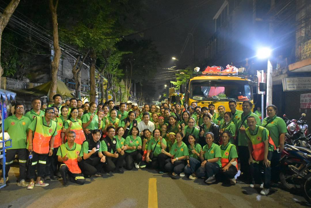 ในการนี้ผู้อำนวยการเขตบางรัก พร้อมด้วยประธานสภากรุงเทพมหานคร และคณะผู้บริหารเขต ลงพื้นที่ดูแลความเรียบร้อย พร้อมให้กำลังใจเจ้าหน้าที่ฝ่ายรักษาความสะอาดฯ ที่เข้าประจำจุดลุยเก็บขยะและทำความสะอาดพื้นที่กันอย่างแข็งขัน ซึ่งนอกจากขยะพลาสติก เศษอาหารหรือเครื่องดื่มแล้ว ระหว่างทางยังมีลูกมะพร้าวที่สานุศิษย์และผู้ร่วมงานเตรียมมาเพื่อชำระล้างพื้นถนนให้สะอาด ซึ่งอีกนัยหนึ่งของการ 'ทุบมะพร้าว' นั่นเพื่อแสดงถึงการละทิ้ง 'อัตตา' ของตัวเอง โดยมีเจ้าหน้าที่เทศกิจที่คอยอำนวยความสะดวกให้กับประชาชนที่สัญจรผ่านไปมาทั่วทั้งงานและตลอดเส้นทางแห่