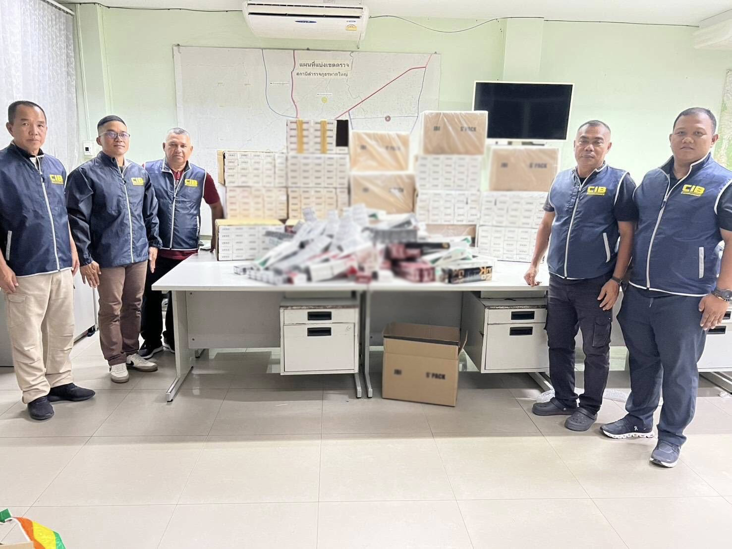 ต่อมาวันที่ 30 กันยายน 2568 เวลาประมาณ 17.10 น. เจ้าหน้าที่จึงเข้าทำการตรวจสอบขนส่งเอกชนย่าน ต.ควนลัง อ.หาดใหญ่ จ.สงขลา โดยมีผู้จัดการของขนส่งเอกชนย่าน ต.ควนลัง เป็นผู้นำการตรวจสอบพบบุหรี่ต่างประเทศที่มิได้เสียอากรแสตมป์สรรพสามิตและไม่ได้ผ่านพิธีการทางศุลกากรบรรจุอยู่ในกล่องลังผลไม้ จำนวนกว่า 128,000 มวน(6,400 ซอง) และบุหรี่ไฟฟ้าชนิดสูบแล้วทิ้งจำนวนกว่า 240 ชิ้น รวมมูลค่าความเสียหายกว่า 5 ล้านบาท ซึ่งเตรียมกระจายส่งตามพื้นที่ต่างๆ เจ้าหน้าที่ตำรวจจึงได้ทำการตรวจยึดของกลางดังกล่าว นำส่ง พนักงานสอบสวน สภ.หาดใหญ่ และ กก.1 บก.ปคบ. เพื่อดำเนินการขยายผลหาตัวพ่อค้าหัวใสมาดำเนินคดีตามกฏหมาย และดำเนินการ เสนอปิดกั้นเว็บไซต์เพื่อตัดวงจรต่อไป
