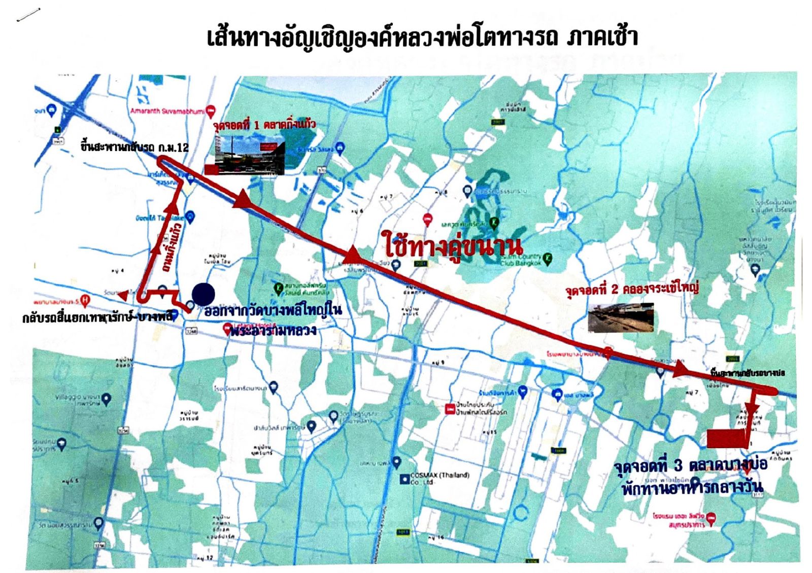 - ใช้ถนนบางนาตราดขาออก ตลอดสาย