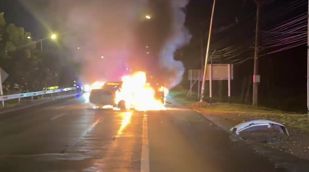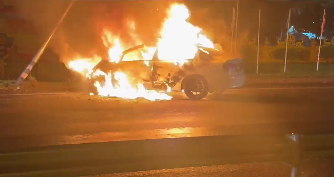 รถเก๋งเสียหลักชนเสาไฟ แล้วเกิดเพลิงไหม้ กลางถนนเพชรเกษม เสียหายวอดทั้งคัน จ.เพชรบุรี