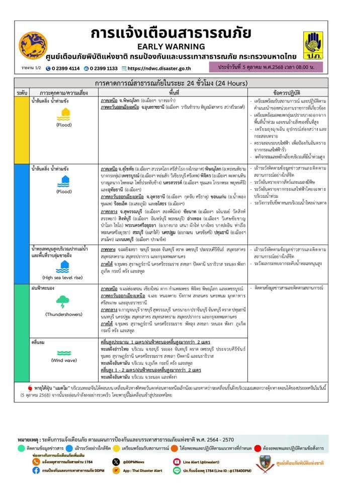 กรมป้องกันเเละบรรเทาสาธารณภัย (ปภ.)รายงานการแจ้งเตือนสาธารณภัย ประจำวันที่ 5 ตุลาคม 2568