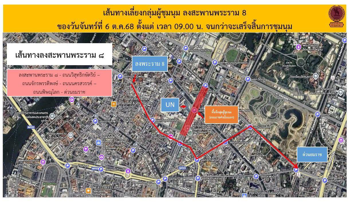 กองบังคับการตำรวจนครบาล 1 แจ้งประชาสัมพันธ์ หลีกเลี่ยงเส้นทางการจราจร เนื่องจากมีกลุ่มผู้ชุมนุม หน้าองค์การสหประชาชาติ (ยูเอ็น) วันจันทร์ที่ 6 ตุลาคม 2568 ตั้งแต่เวลา 09.00 น. เป็นต้นไป จนกว่าจะเสร็จสิ้นการชุมนุม