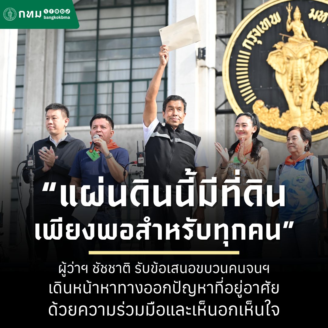 “เรื่องที่อยู่อาศัย เรื่องสาธารณสุข เรื่องการศึกษา เป็น 3 เรื่องหลักที่ทางภาครัฐต้องช่วยสนับสนุน กทม. เองเราไม่ได้มีที่ดิน เราเป็นแค่คนดูแลที่ดินให้กับรัฐบาลในที่สาธารณะ ดังนั้นคงต้องหาทางออกร่วมกัน หลักการของ กทม. คือเราต้องพยายามหาที่อยู่อาศัยทดแทนก่อน อาจจะเป็นบ้านมั่นคง ก่อนที่เราจะขยับพี่น้องประชาชนไป ก็ขอให้ร่วมมือกัน สุดท้ายแล้ว เชื่อว่าแผ่นดินนี้มีที่ดินเพียงพอสำหรับทุกคน ต้องค่อย ๆ คุยกัน แล้วก็หาทางออกร่วมกัน”