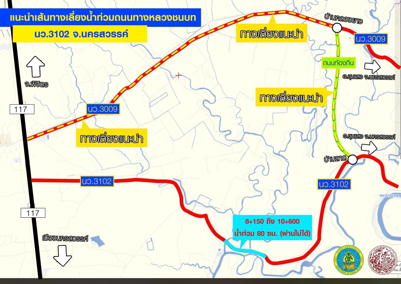 3. ถนนทางหลวงชนบทสาย นว.3102 แยก ทล.117 (กม.ที่ 16+150) - บ้านเนิน อ.เก้าเลี้ยว, ชุมแสง จ.นครสวรรค์ ซึ่งหากต้องการเดินทางจาก กม.ที่ 0+000 ของถนนสายดังกล่าว และต้องการข้ามผ่านบริเวณน้ำท่วม ให้ผู้ใช้รถใช้ถนนเดินทางย้อนกลับไปยัง ทล.117 มุ่งหน้าเข้าถนนทางหลวงชนบทสาย นว.3009 กม.ที่ 0+000 เดินทางจนถึง กม.ที่ 9+800 จากนั้นให้ใช้แยกเข้าถนนท้องถิ่น ระยะทาง 7.500 กิโลเมตร จะสามารถเดินกลับมายังถนนทางหลวงชนบทสาย นว.3102 และหลีกเลี่ยงบริเวณน้ำท่วมได้