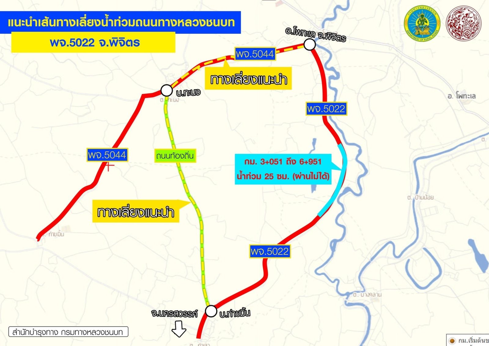 5. ถนนทางหลวงชนบทสาย พจ.5022 เชื่อมถนนเทศบาลตำบลโพทะเล - บ้านบางพล้อ อ.โพทะเล จ.พิจิตร ผู้ใช้รถสามารถขับเข้าถนนทางหลวงชนบทสาย พจ.5044 เชื่อมถนนเทศบาลตำบลโพทะเล - บ้านหนองขอนได้ ประมาณ ช่วงกม.ที่ 0+000 - กม.ที่ 24+000 จากนั้นเลี้ยวซ้าย เข้าช่วงปลายสายของถนนทางหลวงชนบทสาย พจ.5022 ได้ เพื่อหลีกเลี่ยงบริเวณน้ำท่วม
