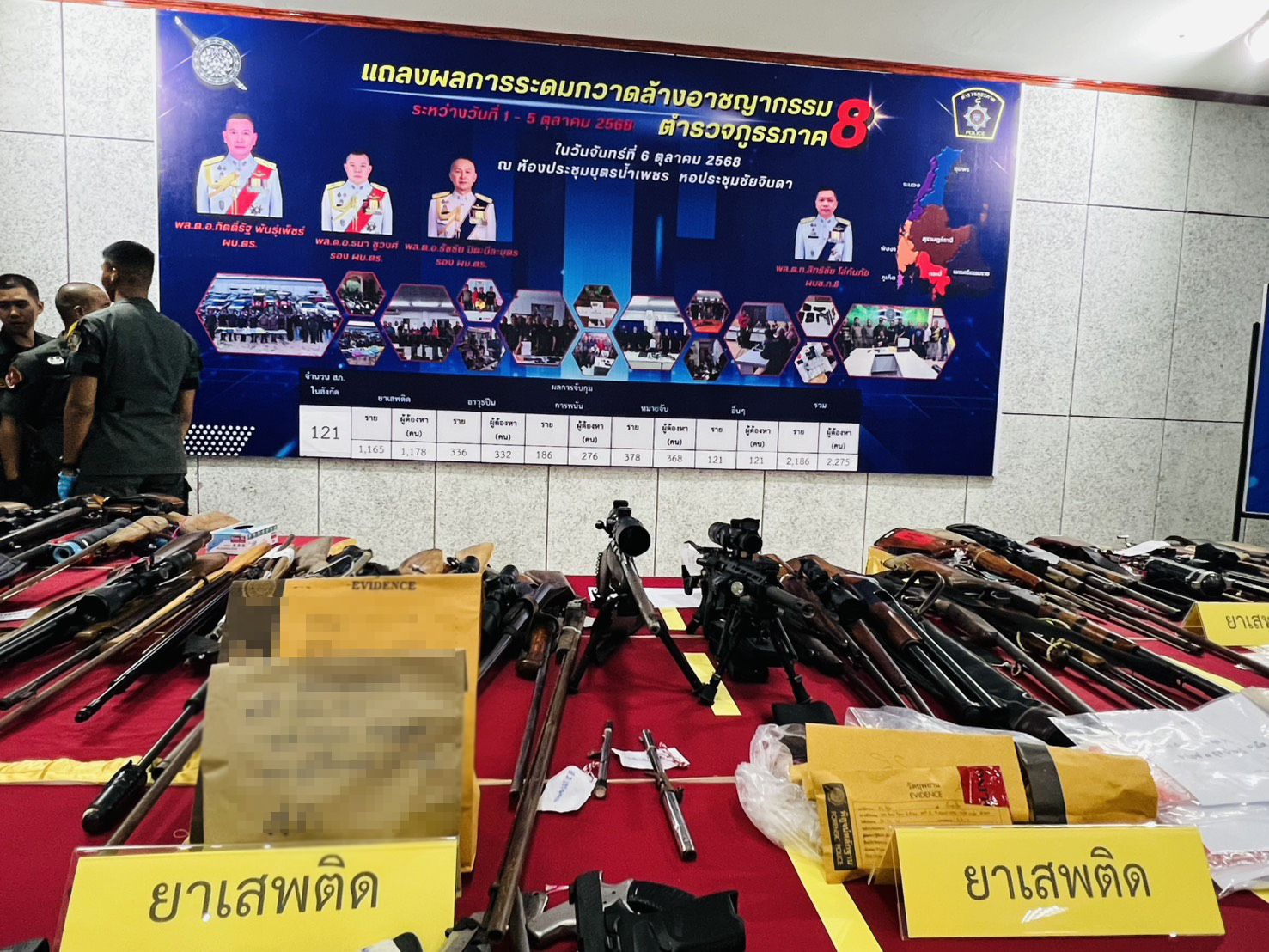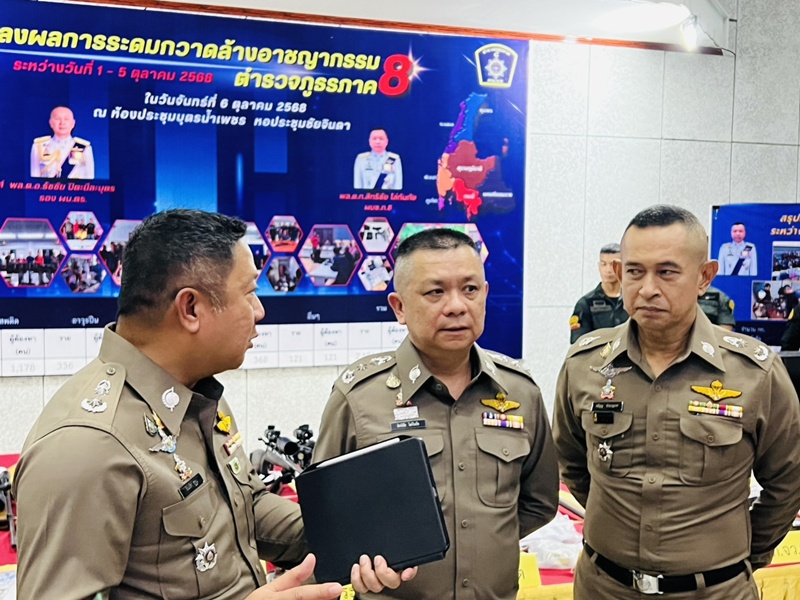 ตำรวจภูธรภาค 8 ระดมกวาดล้างอาชญากรรม 5 วัน จับกุมผู้ต้องหายาเสพติด อาวุธปืน บ่อนการพนัน อื่นๆ รวม 2.168 คดี ผู้ต้องหา 2,275 คน