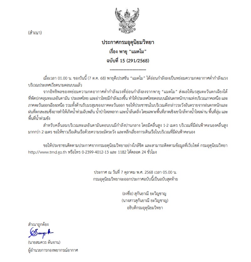 ประกาศ ณ วันที่ 7 ตุลาคม พ.ศ. 2568 เวลา 05.00 น.