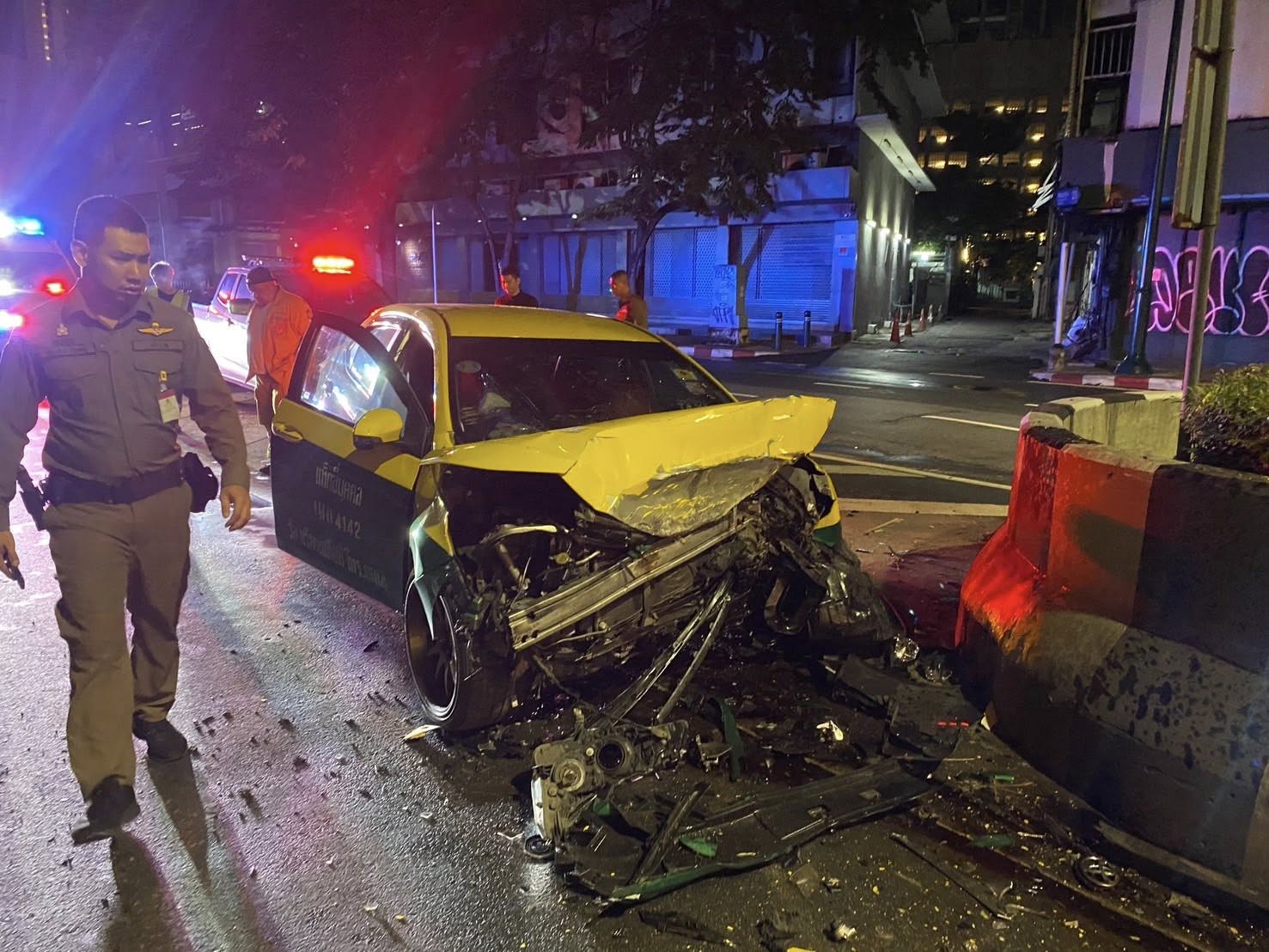 ที่เกิดเหตุบริเวณกลางถนนทางแบ่งช่องจราจร มุ่งหน้าสะพานควาย และตลาด อ.ต.ก. เขตจตุจักร พบรถแท็กซี่ส่วนบุคคล สีเขียว-เหลือง ทะเบียน 1มก-4142 กทม. สภาพหน้ารถพังยับพุ่งชนแบริเออร์คอนกรีต จากการตรวจสอบพบผู้ขับขี่แต่งกายสวมเสื้อกีฬา สีน้ำเงิน นุ่งกางเกงวอร์ม ขายาว สีดำ สภาพร่างถูกแรงกระแทกเสียชีวิต เป็นชาย อายุ 38 ปี เจ้าหน้าที่จึงบันทึกรวบรวมที่เกิดเหตุไว้เป็นหลักฐาน ก่อนนำศพส่งสถาบันนิติเวช รพ.ตำรวจ