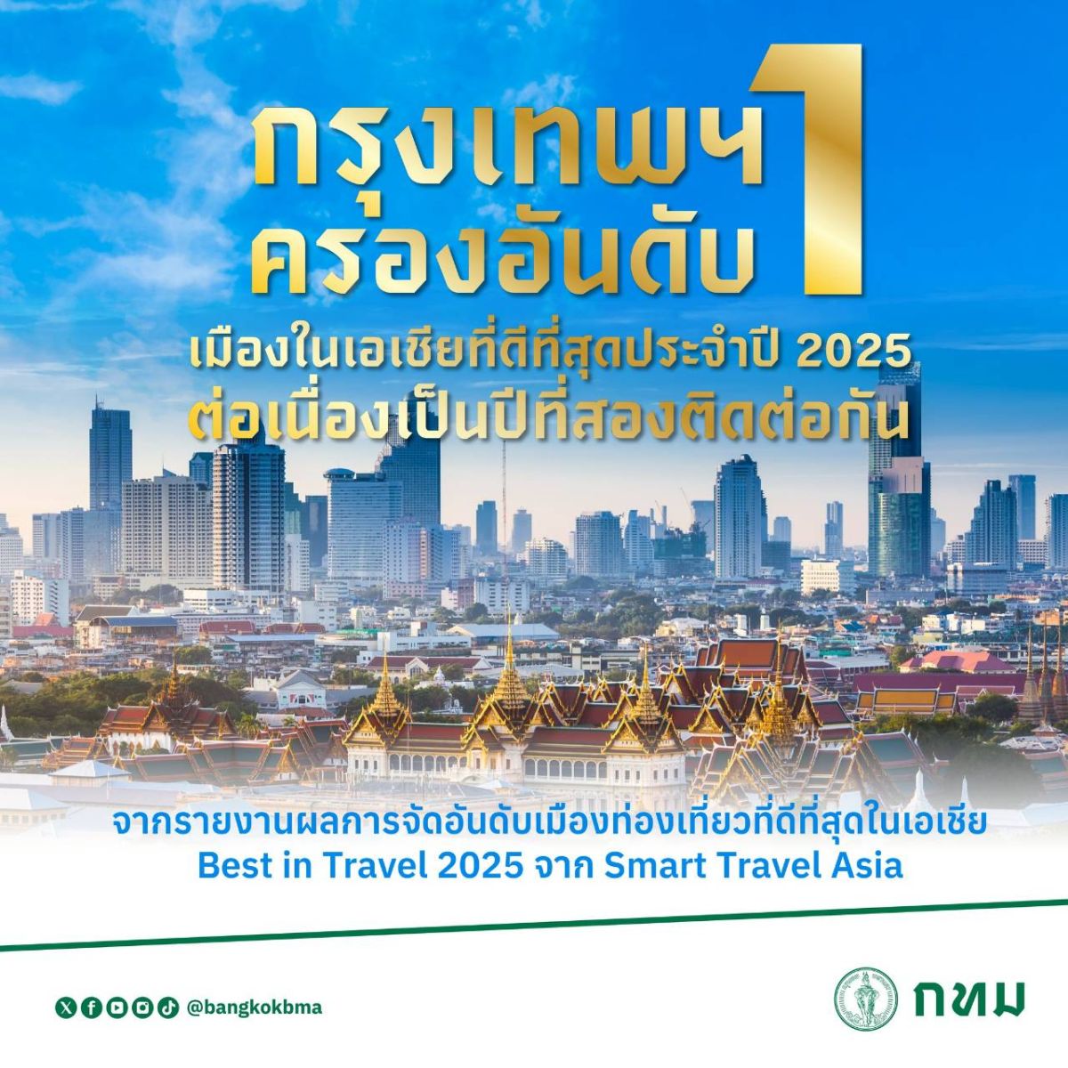 (8 ต.ค. 68) นายเอกวรัญญู อัมระปาล โฆษกของกรุงเทพมหานคร เปิดเผยว่า “กรุงเทพฯ” ได้รับการจัดอันดับให้เป็นเมืองท่องเที่ยวที่ดีที่สุดในเอเชีย ประจำปี 2025 จากรายงาน Best in Travel 2025 โดยเว็บไซต์ท่องเที่ยวระดับนานาชาติ Smart Travel Asia ซึ่งจัดอันดับจากผลการสำรวจความคิดเห็นของนักเดินทางทั่วโลก และปีนี้กรุงเทพฯ ยังคงครองแชมป์อันดับหนึ่งต่อเนื่องเป็นปีที่สอง