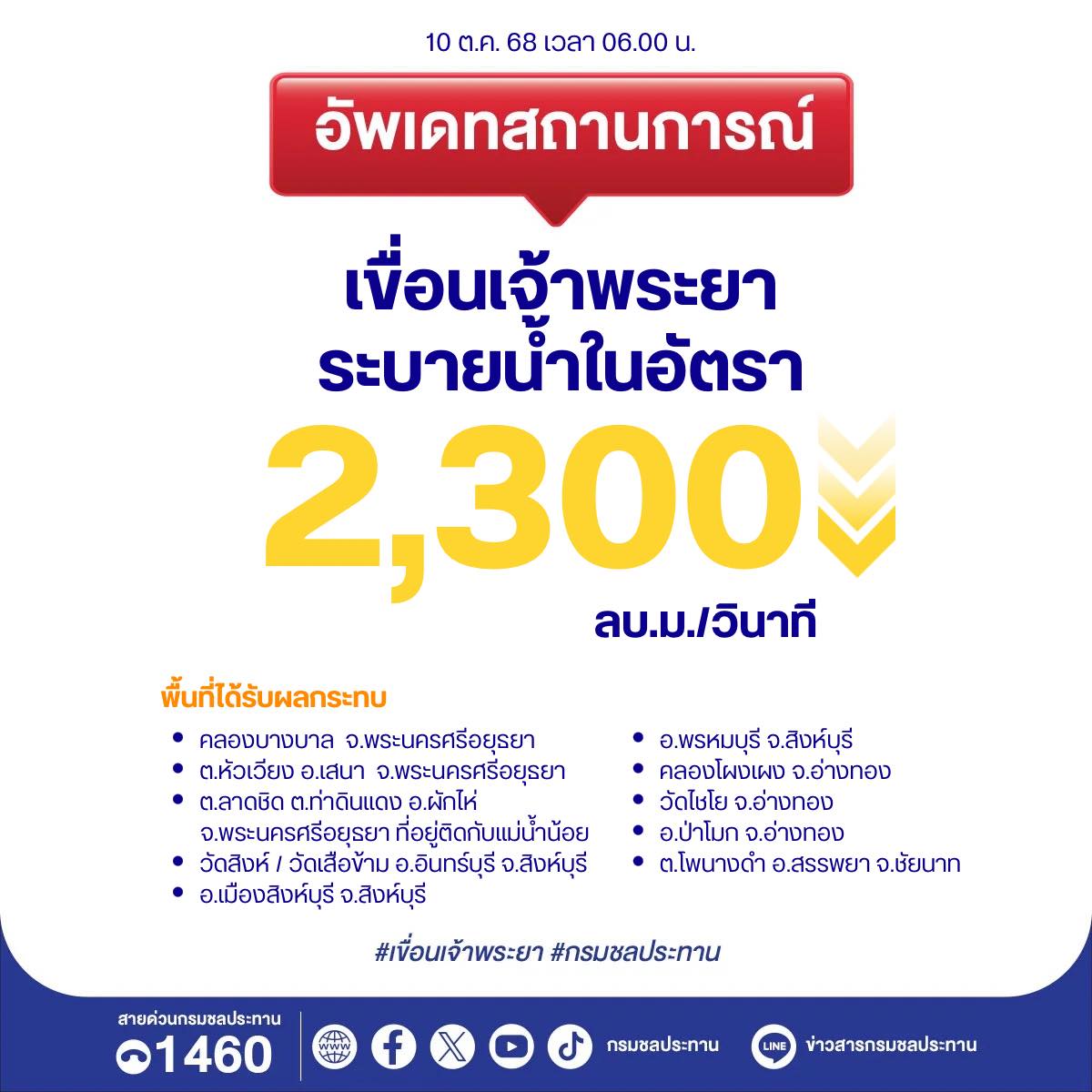 กรมชลประทาน อัปเดตสถานการณ์น้ำเจ้าพระยา 10 ตุลาคม 2568 เวลา 06.00 น.