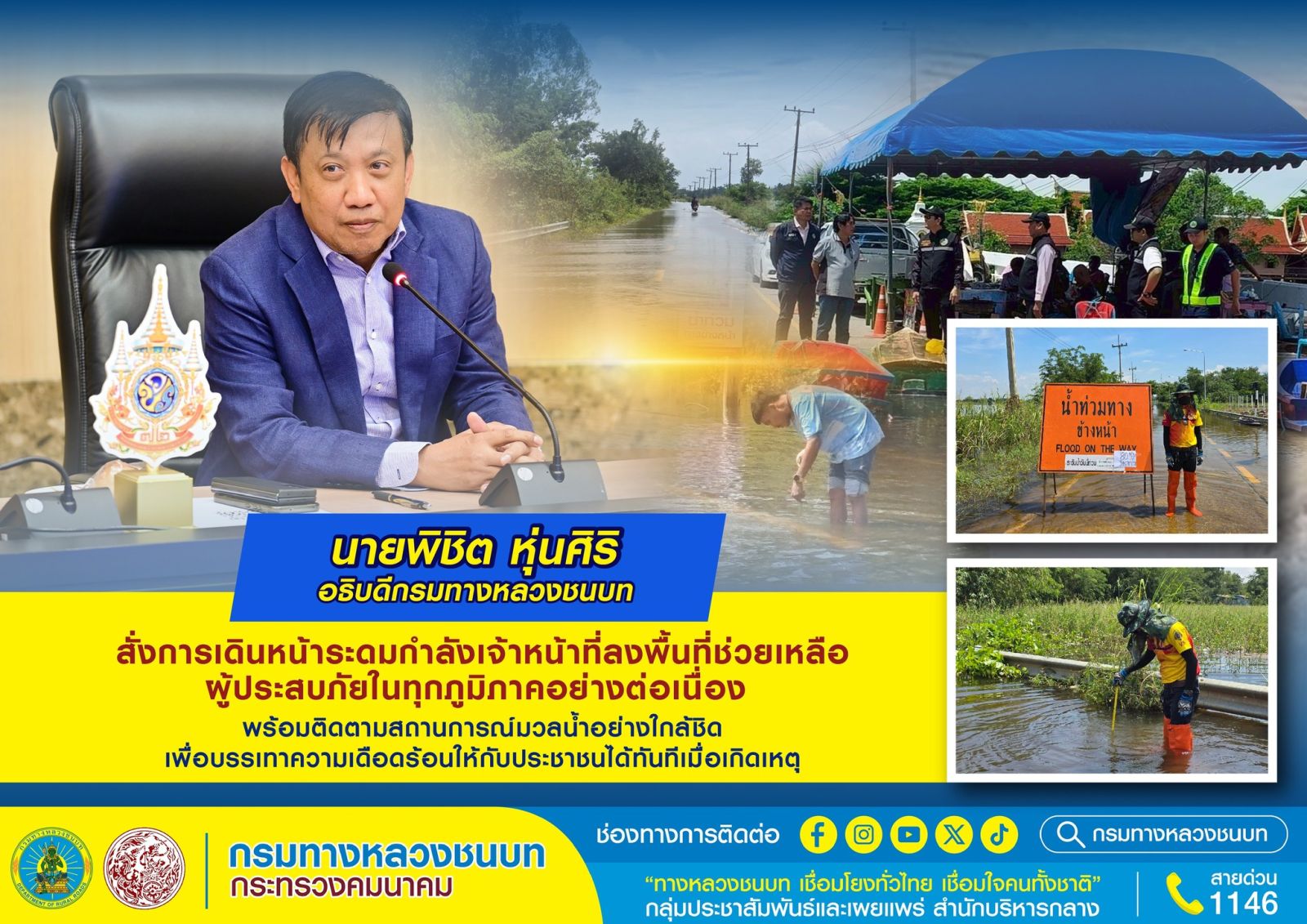 อธิบดีกรมทางหลวงชนบท สั่งการเดินหน้าระดมกำลังเจ้าหน้าที่ลงพื้นที่ช่วยเหลือผู้ประสบภัยในทุกภูมิภาคอย่างต่อเนื่อง พร้อมติดตามสถานการณ์มวลน้ำอย่างใกล้ชิด เพื่อบรรเทาความเดือดร้อนให้กับประชาชนได้ทันทีเมื่อเกิดเหตุ