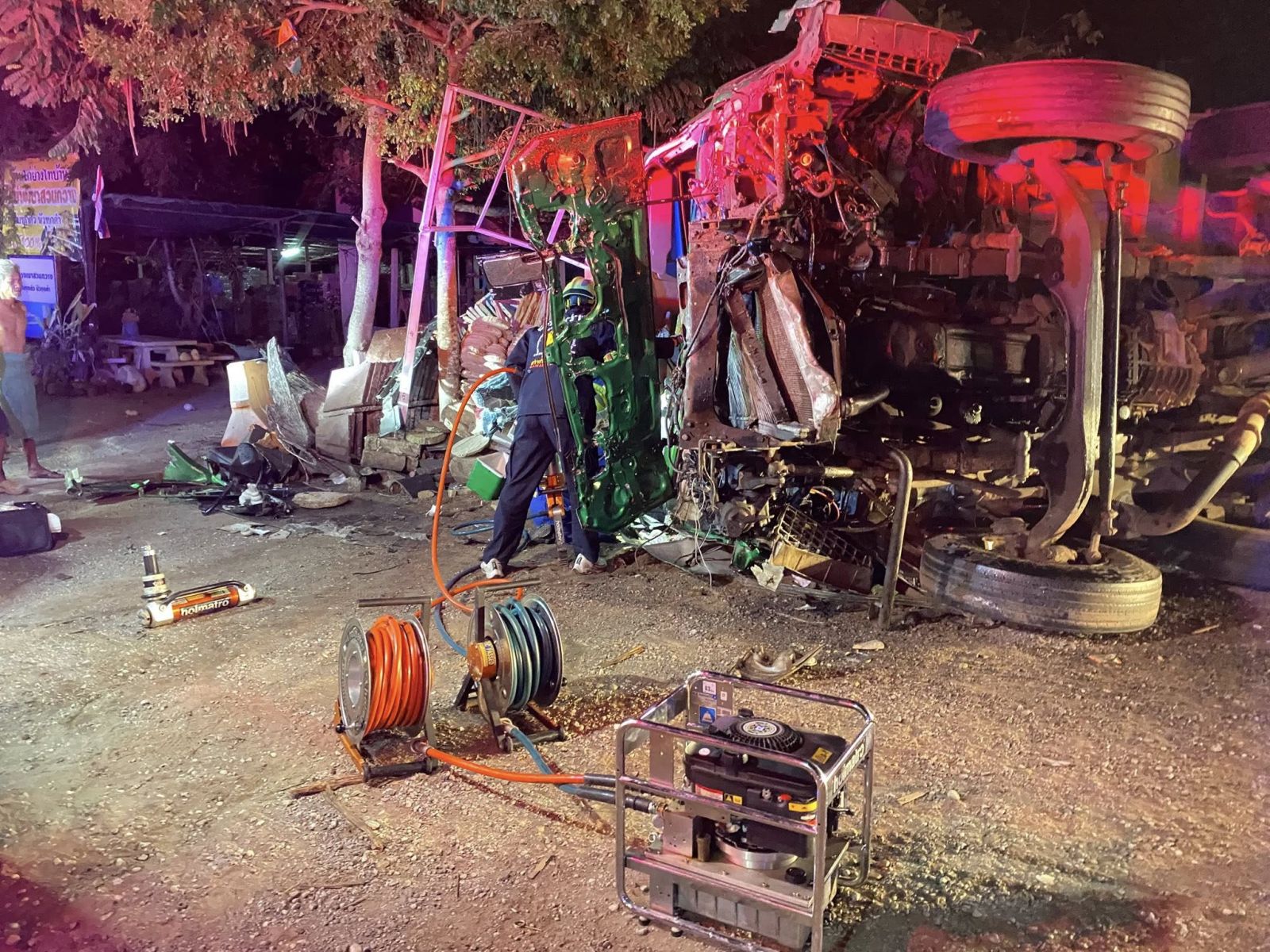ที่เกิดเหตุ พบรถบรรทุก 10 ล้อ พลิกตะแคงอยู่ข้างทาง และใกล้กันพบรถพ่วง ป้ายทะเบียน นครราชสีมา พลิกตะแคงและมีท่อนไม้ตกเกลื่อนถนน