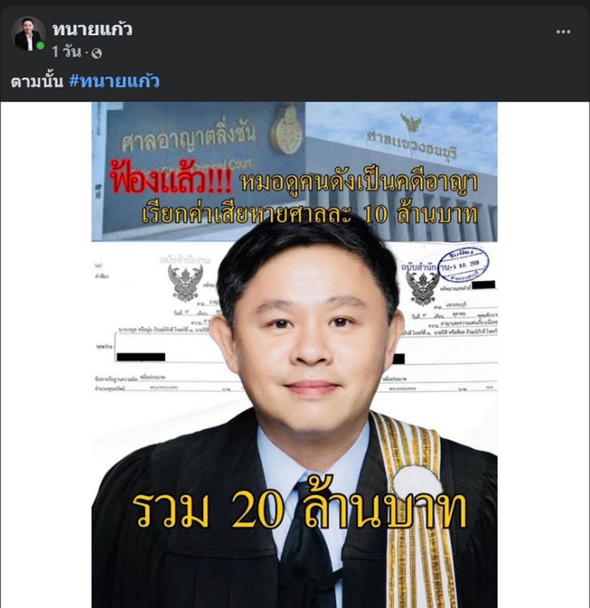โดยในภาพระบุข้อความ "ฟ้องแล้ว!!! หมอดูคนดังเป็นคดีอาญา เรียกค่าเสียหายศาลละ 10 ล้านบาท รวม 20 ล้านบาท ซึ่งทนายแก้ว โพสต์ภาพดังกล่าวพร้อมแคปชั่นด้วยว่า ตามนั้น ทนายแก้ว"