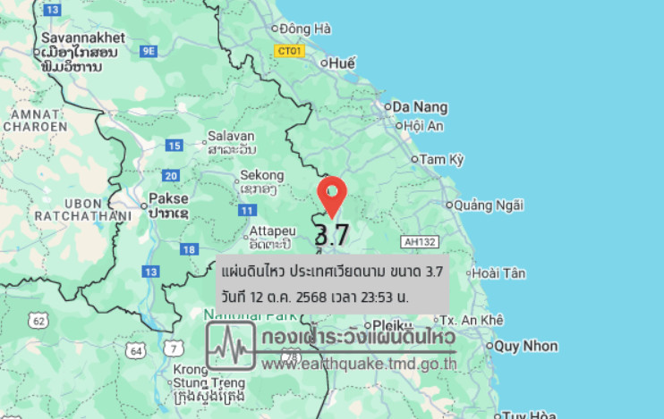 วันที่ 12 ต.ค. 2568 เวลา 23:53 น. กองเฝ้าระวังแผ่นดินไหว กรมอุตุนิยมวิทยา แจ้งเหตุแผ่นดินไหว ขนาด 3.7 ความลึก 10 กม. ภายในพื้นที่ของประเทศเวียดนาม (14.98°N,107.67°E) ศูนย์กลาางห่างออกไปทางทิศตะวันออกเฉียงใต้ของ อ.เมือง จ.อุบลราชธานี ประมาณ 304 กม. ยังไม่มีรายงานผลกระทบต่อประเทศไทย