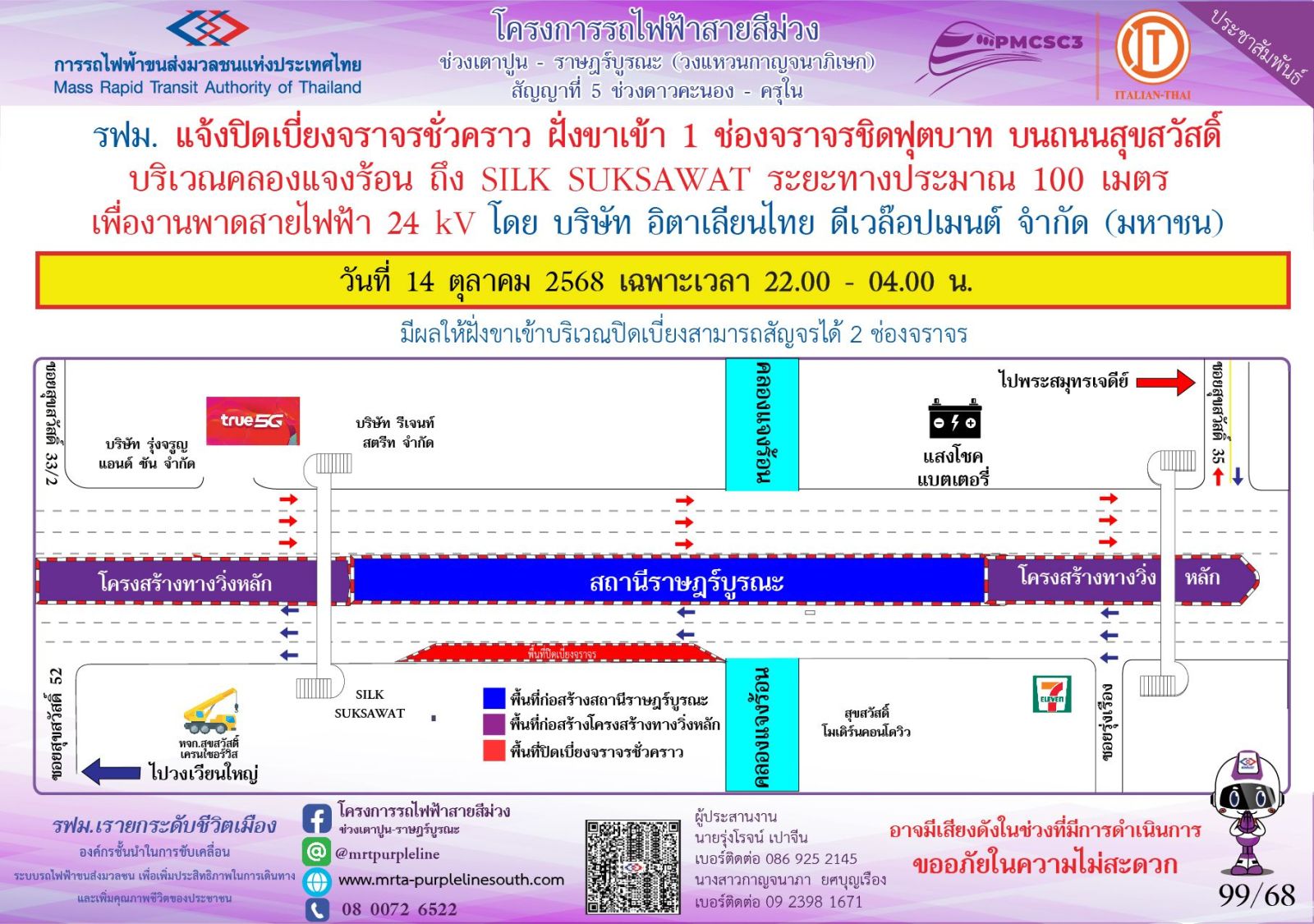 การรถไฟฟ้าขนส่งมวลชนแห่งประเทศไทย (รฟม.) แจ้งว่า บริษัท อิตาเลียนไทย ดีเวล๊อปเมนต์ จำกัด (มหาชน) ผู้รับจ้างงานก่อสร้างทางวิ่งและสถานียกระดับ อาคารจอดรถไฟฟ้าและอาคารจอดแล้วจร โครงการรถไฟฟ้าสายสีม่วง ช่วงเตาปูน - ราษฎร์บูรณะ (วงแหวนกาญจนาภิเษก) สัญญาที่ 5 ช่วงดาวคะนอง - ครุใน มีความจำเป็นต้องปิดเบี่ยงจราจรชั่วคราว ฝั่งขาเข้า 1 ช่องจราจร ชิดฟุตบาท บนถนนสุขสวัสดิ์ บริเวณคลองแจงร้อน ถึง SILK SUKSAWAT ระยะทางประมาณ 100 เมตร เพื่องานพาดสายไฟฟ้า 24 kV ในวันที่ 14 ตุลาคม 2568 เฉพาะเวลา 22.00 - 04.00 น. โดยมีผลให้ฝั่งขาเข้าบริเวณปิดเบี่ยงสามารถสัญจรได้ 2 ช่องจราจร