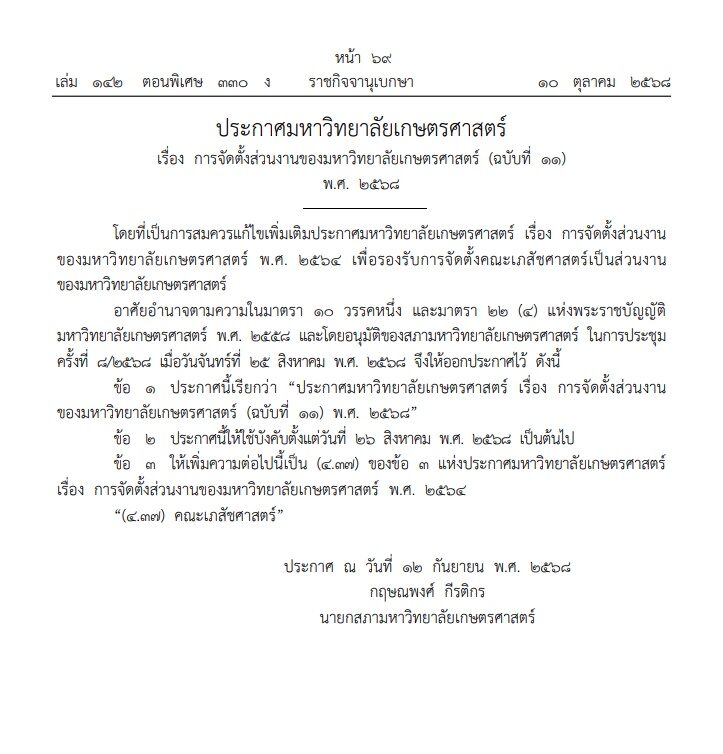 14 ตุลาคม 2568 เว็บไซต์ราชกิจจานุเบกษาเผยแพร่ ประกาศมหาวิทยาลัยเกษตรศาสตร์ เรื่อง การจัดตั้งส่วนงานของมหาวิทยาลัยเกษตรศาสตร์ (ฉบับที่ 11) พ.ศ.2568 เมื่อวันที่ 10 ตุลาคมที่ผ่านมา ประเด็นสำคัญคือการจัดตั้งคณะเภสัชศาสตร์ ลงนามโดย นายกฤษณพงศ์ กีรติกร นายกสภามหาวิทยาลัยเกษตรศาสตร์ "ความว่า โดยที่เป็นการสมควรแก้ไขเพิ่มเติมประกาศมหาวิทยาลัยเกษตรศาสตร์ เรื่อง การจัดตั้งส่วนงานของมหาวิทยาลัยเกษตรศาสตร์ พ.ศ.2564 เพื่อรองรับการจัดตั้งคณะเภสัชศาสตร์เป็นส่วนงานของมหาวิทยาลัยเกษตรศาสตร์