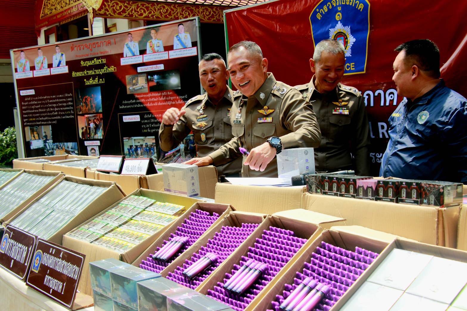 ที่ บช.ภ.1 พล.ต.ท.วัฒนา ยี่จีน ผบช.ภ.1 , พล.ต.ต.วิชิต บุญชินวุฒิกุล รอง ผบช.ภ.1 , พล.ต.ต.วรชาติ แสนคำ ผบก.สส.ภ.1 , พ.ต.อ.พูนสุข เตชะประเสริฐ์พร ผกก.1 บก.สส.ภ.1 ร่วมกันแถลงข่าวจับกุม นายมู (นามสมมุติ) อายุ 23 ปี และนายอู (นามสมมุติ) อายุ 28 ปี พร้อมของกลาง บุหรี่ไฟฟ้า จำนวน 48,301 ชิ้น รถกระบะโตโยต้า 2 คัน โทรศัพท์มือถือ 4 เครื่อง