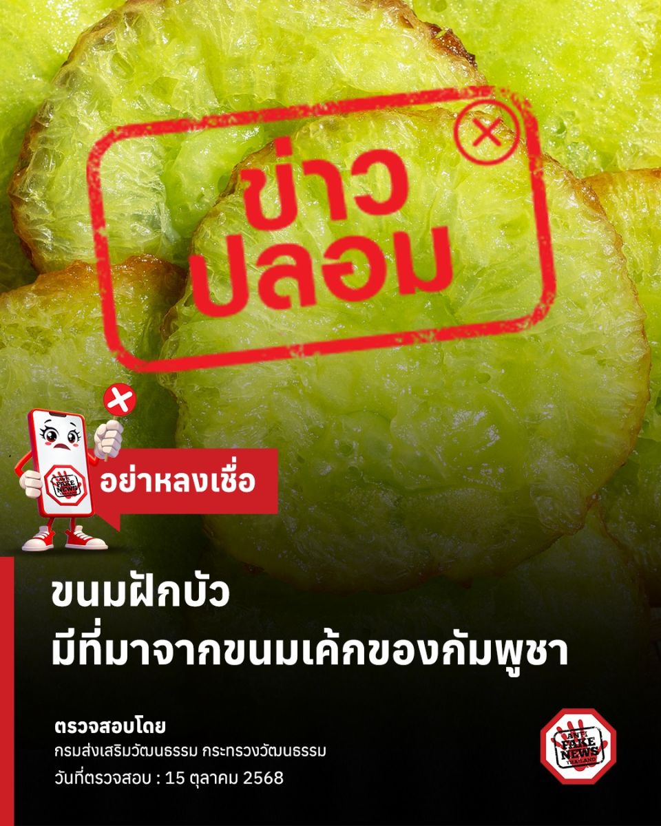 15 ตุลาคม 2568 จากกรณีที่มีการแชร์กันในโลกออนไลน์ว่า “ขนมฝักบัว” มีที่มาจากขนมเค้กของกัมพูชานั้น ล่าสุด ศูนย์ต่อต้านข่าวปลอม โพสต์ข้อความผ่านเพจ Anti-Fake News Center Thailand ระบุ ขนมดอกบัว หรือ ขนมฝักบัว เป็นขนมของไทยที่มีมาตั้งแต่สมัยโบราณ ซึ่งมีชื่อเรียกประจำถิ่นแตกต่างกันไป เช่น คนภาคกลางเรียกว่า "ขนมดอกบัว หรือ ขนมฝักบัว" ส่วนคนภาคใต้เรียก "จูจุ่น"