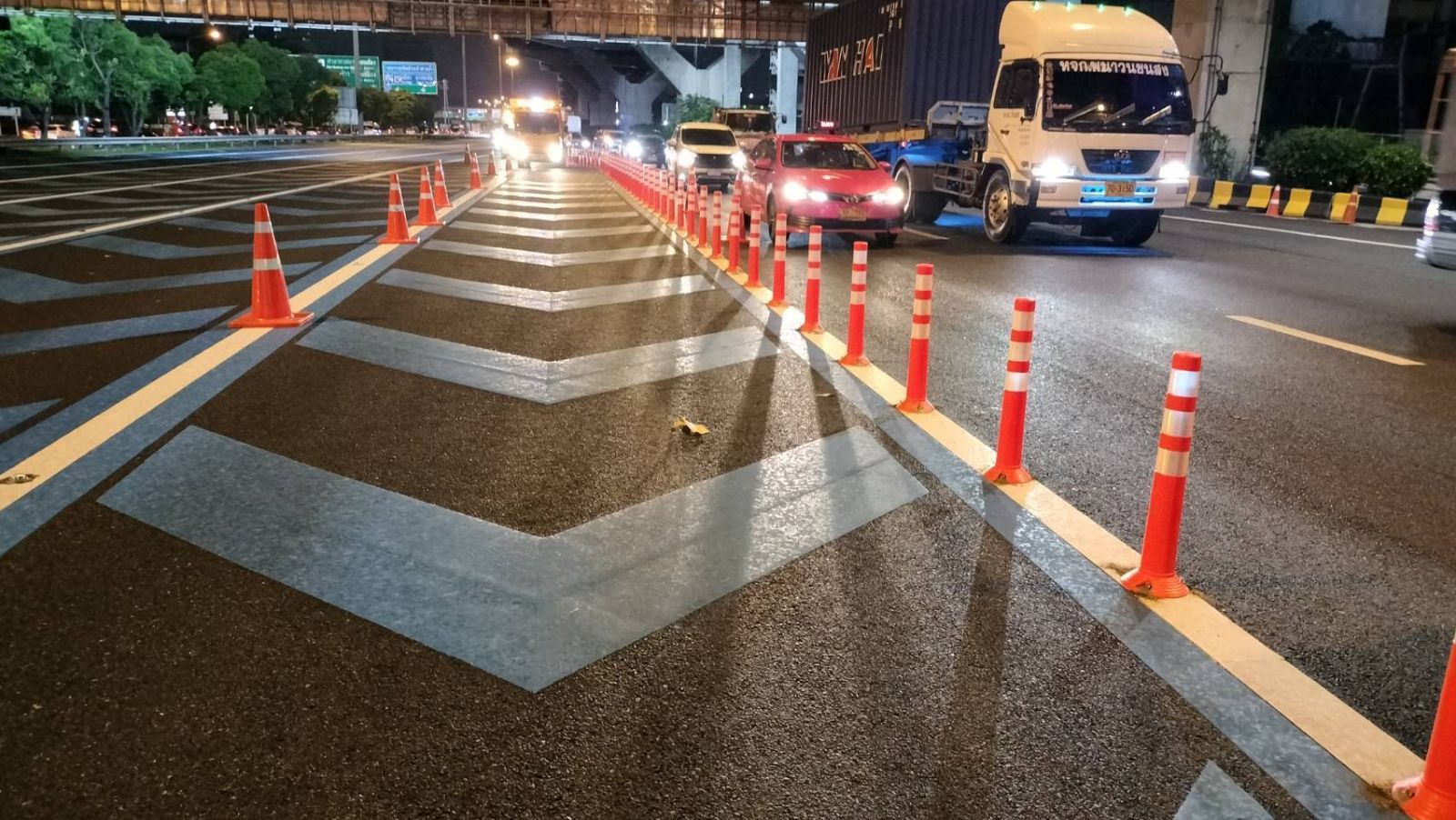 กทพ. จึงได้ดำเนินการติดตั้งเสาล้มลุกบริเวณหน้าด่านฯ ดินแดง ทางพิเศษเฉลิมมหานคร ระหว่างช่องที่ 4 และช่องที่ 5 เป็นระยะทาง 65 เมตร ระยะห่างแต่ละเสา 1 เมตร ตามแนวเครื่องหมายจราจรบนพื้นทาง Cheron Hatching สีฟ้า โดยเว้นระยะเสาต้นแรกจากตุ้มหน้าด่านฯ เป็นระยะทาง 5 เมตร เพื่อแก้ปัญหาจราจรติดขัดท้ายแถวคอยของรถในช่องเงินสดมาเบียดแทรกรถผู้ใช้บริการที่จะเข้าช่อง Easy Pass