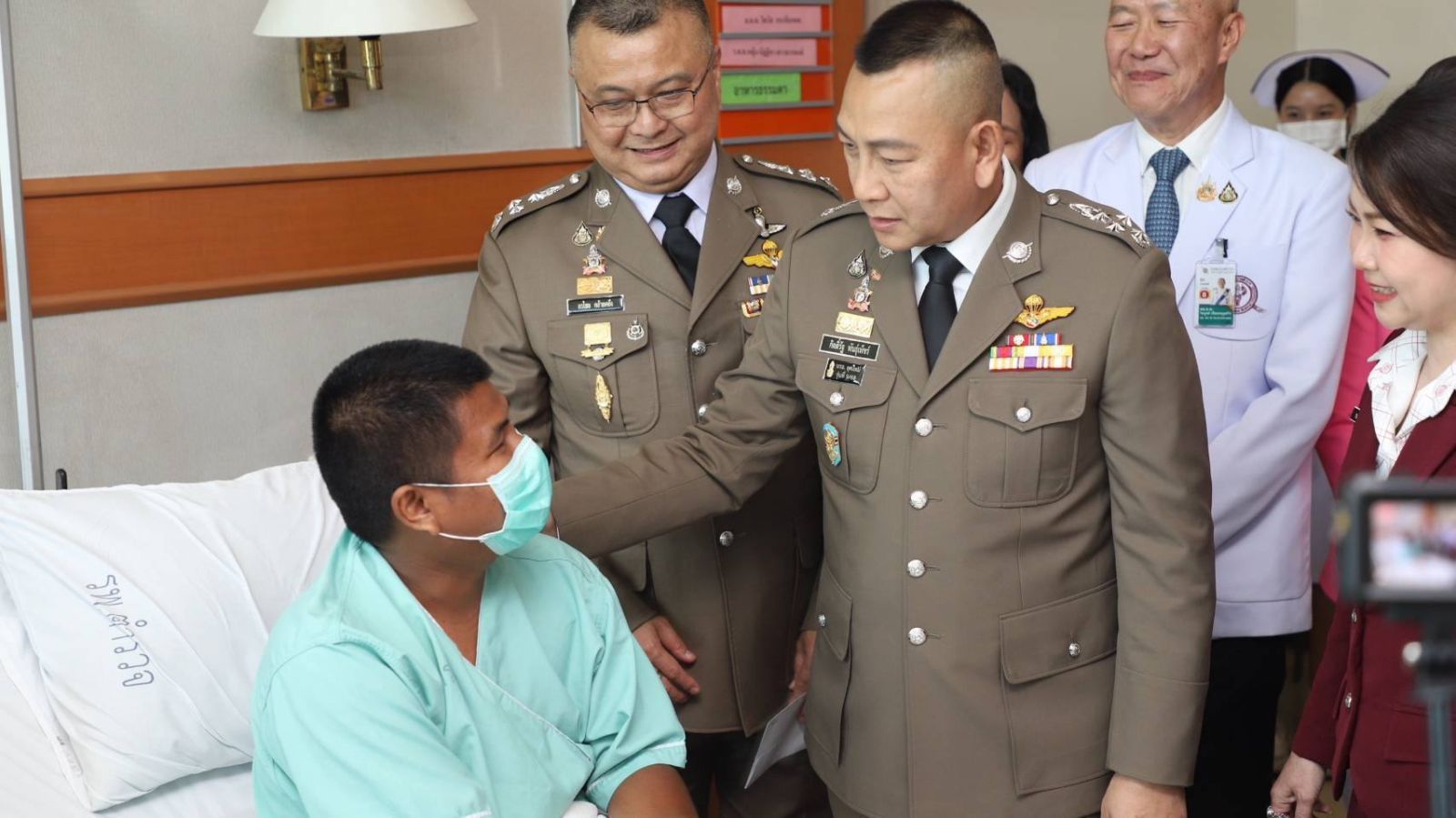 ทั้งนี้ ผู้บัญชาการตำรวจแห่งชาติพร้อมคณะผู้บังคับบัญชาได้สอบถามอาการบาดเจ็บ และรับฟังการรายงานจากทีมแพทย์ผู้ดูแล พร้อมทั้งให้คำแนะนำเกี่ยวกับการดูแลรักษาและการฟื้นฟูสภาพร่างกาย เพื่อให้ผู้บาดเจ็บสามารถกลับมาปฏิบัติหน้าที่ได้อย่างปลอดภัยและมีสุขภาพแข็งแรงโดยเร็ว และกล่าวให้กำลังใจแก่ครอบครัวของข้าราชการตำรวจที่บาดเจ็บ พร้อมกำชับทีมแพทย์ให้ดูแลข้าราชการตำรวจและครอบครัวอย่างดีที่สุด เพื่อเป็นการสร้างขวัญกำลังในการช่วยฟื้นฟูสุขภาพให้แก่ผู้ป่วย และในโอกาสเดียวกันคณะผู้บังคับบัญชาได้มอบเงินจำนวนหนึ่งในการช่วยครอบครัวของข้าราชการตำรวจผู้ที่ได้รับบาดเจ็บ เพื่อเป็นค่าใช้จ่ายภายในครอบครัว ซึ่งสร้างความปลาบปลื้มและซาบซึ้งใจแก่ข้าราชการตำรวจและครอบครัวเป็นอย่างยิ่ง
