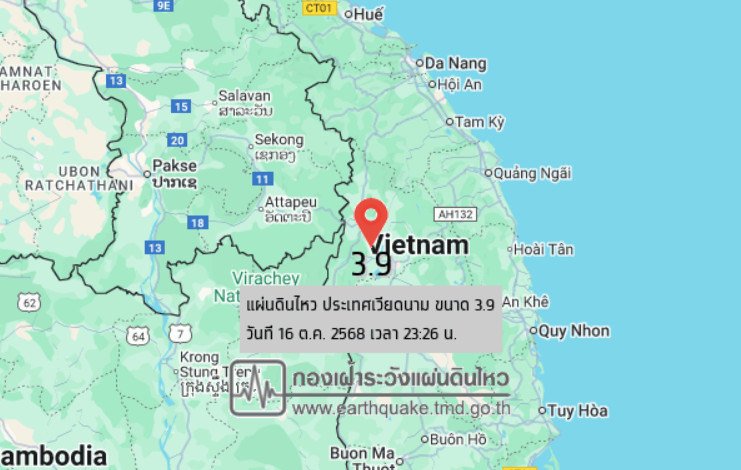 วันที่ 16 ต.ค. 2568 เวลา 23:26 น. กองเฝ้าระวังแผ่นดินไหว กรมอุตุนิยมวิทยา แจ้งเหตุ แผ่นดินไหว ขนาด 3.9 ความลึก 10 กม. ภายในพื้นที่ของประเทศเวียดนาม (14.48°N,107.79°E) ศูนย์กลางห่างออกไปทางทิศตะวันออกเฉียงใต้ของ อ.เมือง จ.อุบลราชธานี ประมาณ 326 กม. ขณะนี้ยังไม่มีรายงานผลกระทบต่อประเทศไทย