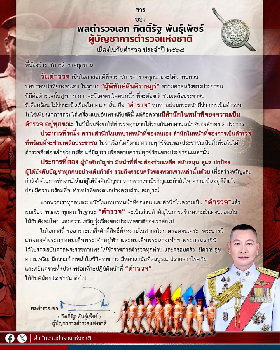พล.ต.อ.กิตติ์รัฐ พันธุ์เพ็ชร์ ผู้บัญชาการตำรวจแห่งชาติ มีสารถึงข้าราชการตำรวจกว่า 2 แสนนาย ทั่วประเทศ เนื่องในวันตำรวจ ประจำปี 2568 ซึ่งตรงกับวันที่ 17 ตุลาคม 2568 ดังนี้