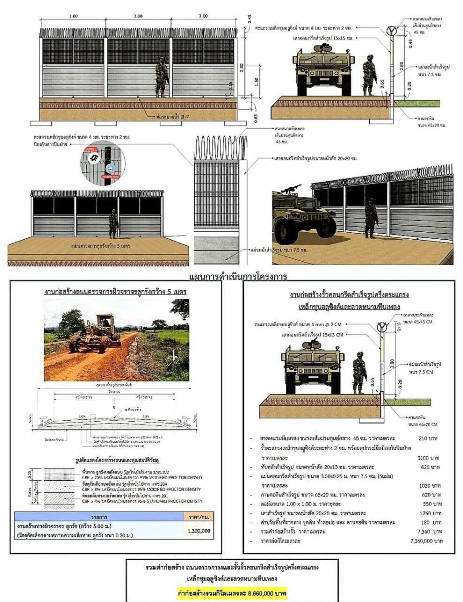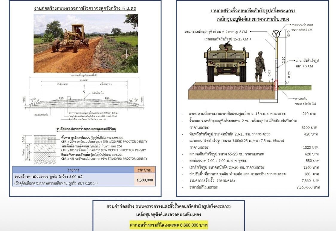 รวมค่าก่อสร้างรั้ว ราคาเมตรละ 7,360 บาท ราคาต่อกิโลเมตรละ 7,360,000 บาท