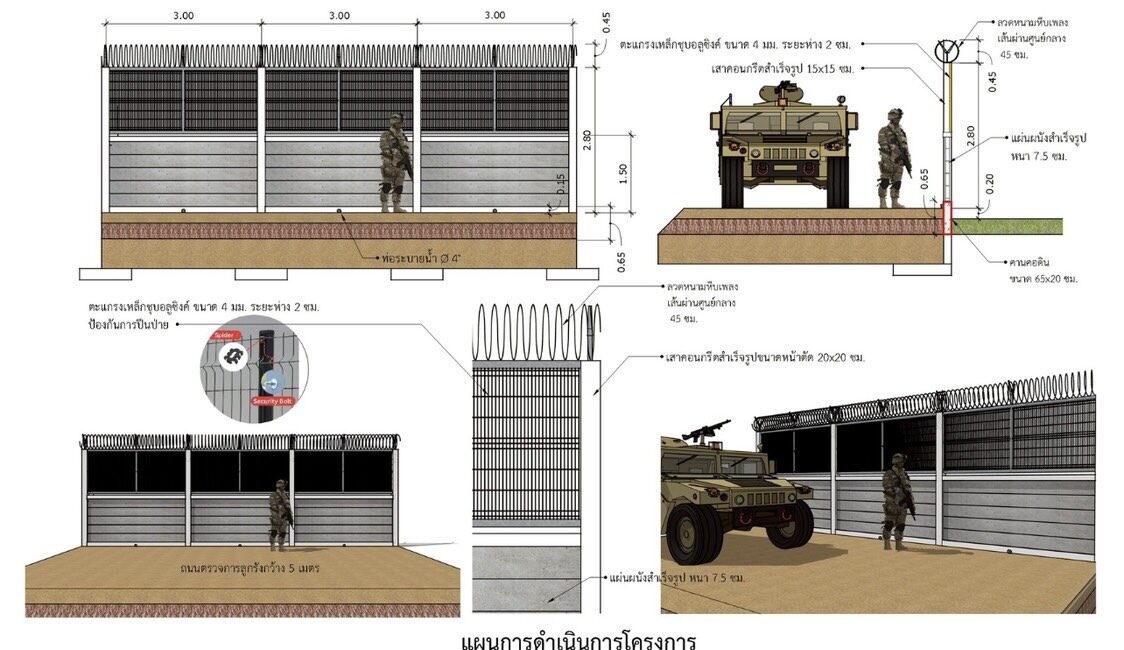 17 ตุลาคม 2568 ผู้สื่อข่าวรายงานว่า วานนี้ (16 ต.ค.68) กองบัญชาการกองทัพไทย (บก.ทท.) เปิด แบบ แผนการดำเนินการโครงการสร้างรั้วคอนกรีตสำเร็จรูป ครึ่งตะแกรงเหล็ก ชุบอลูซิงค์ ติด ลวดหนามหีบเพลง ที่จะสร้างกั้นชายแดนไทย-กัมพูชา โดยหน่วยบัญชาการทหารพัฒนา (นทพ.) กองบัญชาการกองทัพไทย พร้อมถนนตรวจการณ์
